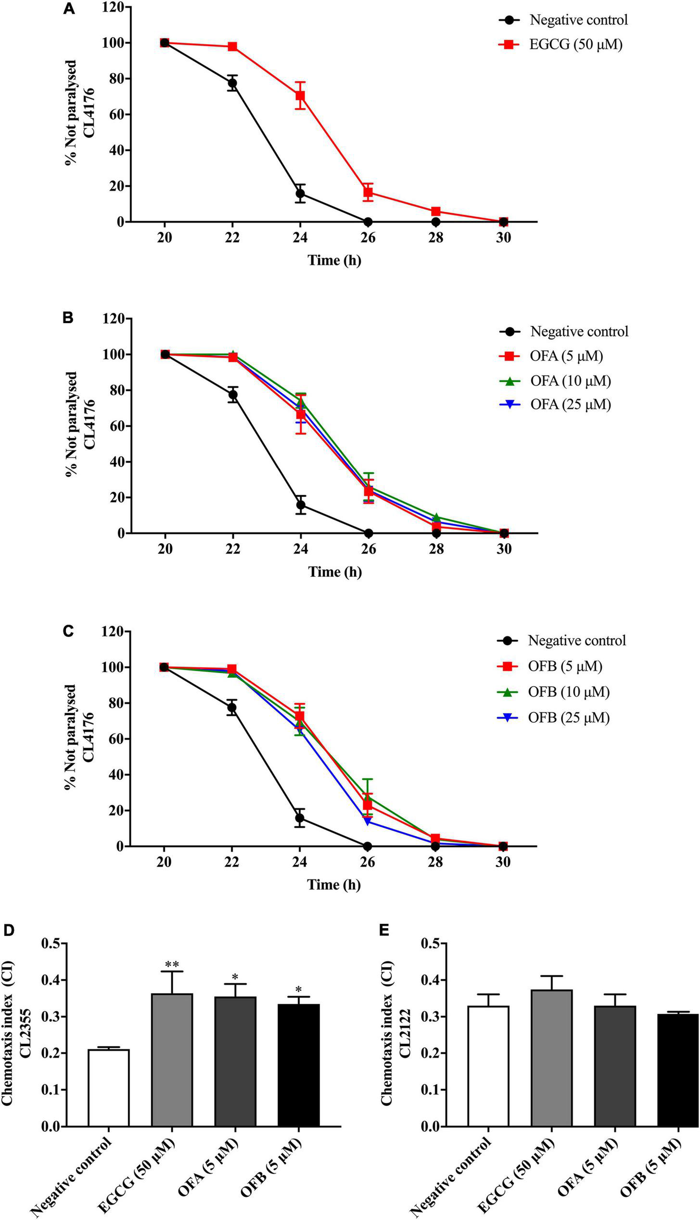 Effect of EGCG, OFA, and OFB on Aβ -induced paralysis in transgenic stain AD model CL4176 (A–C). The indicated times are from the initiation of the temperature shift up. Effect of EGCG, OFA, and OFB on Aβ -induced deficit in chemotaxis behavior in transgenic strain AD model CL2355 (D). EGCG, OFA, and OFB didn’t affect the chemotaxis behaviour of the control strain CL2122 (E). All data are shown as the mean ± SEM (n ≥ 3 independent experiments). *p < 0.05, **p < 0.01 compared to the negative control.