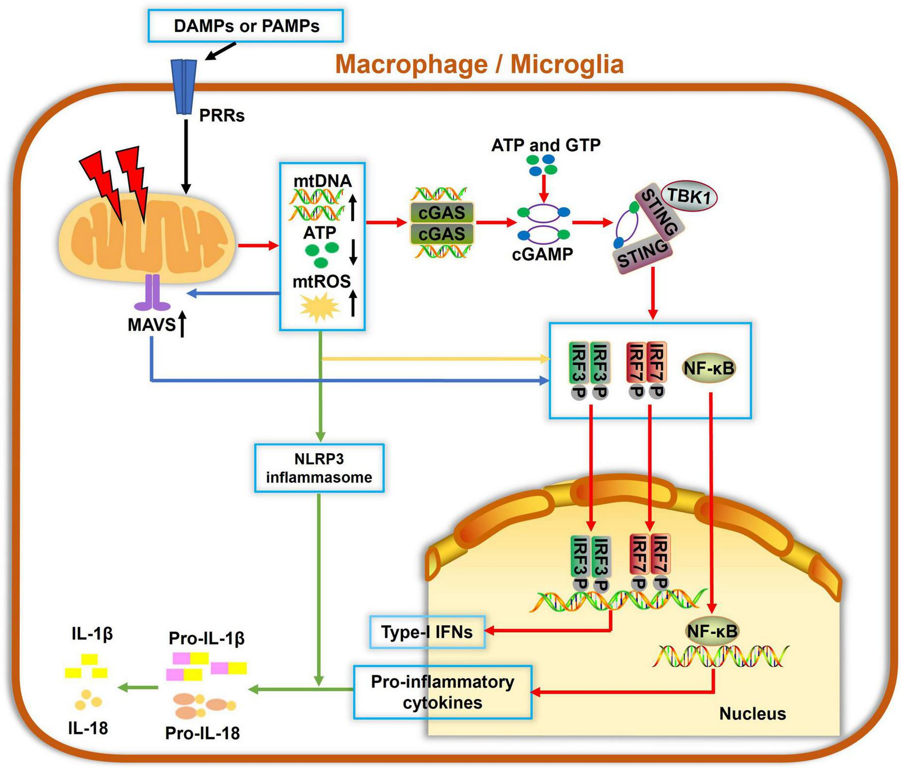 Mitochondria involvement in innate immune responses in macrophage/microglia. Damage-associated molecular patterns (DAMPs) and pathogen-associated molecular patterns (PAMPs) can be recognized by pattern recognition receptors (PRRs) to cause mitochondrial damage, which leads to increased mitochondrial reactive oxygen species (mtROS) formation, mitochondrial DNA (mtDNA) release, and decreased ATP generation. Cyclic guanosine monophosphate-adenylate synthetase (cGAS) is a cellular DNA sensor that primarily recognizes double-stranded DNA, i.e., mtDNA, using ATP and GTP as substrates to produce the second messenger cGAMP, which then binds to and trigger stimulator of interferon genes (STING) oligomerization. Activated STING recruits TBK1 and activate downstream IRF3, IRF7, or nuclear factor-κB (NF-κB), ultimately inducing the expressions of type-I interferons (IFNs) and proinflammatory cytokines. Also, mtDNA and mtROS are canonical activators of the NLRP3 inflammasome and IL-1β secretion. Additionally, mitochondrial antiviral signaling (MAVS) protein is a RIG-like receptor (RLR) localized on the OMM. mtROS accumulation potentiates the MAVS downstream cascade, which also contributes to activations of NF-κB, IRF3, and IRF7, leading to a pronounced generation of cytokines and IFNs. Collectively, damaged mitochondria serve as hubs of multiple signaling cascades in facilitating innate immune responses in macrophages and microglia.