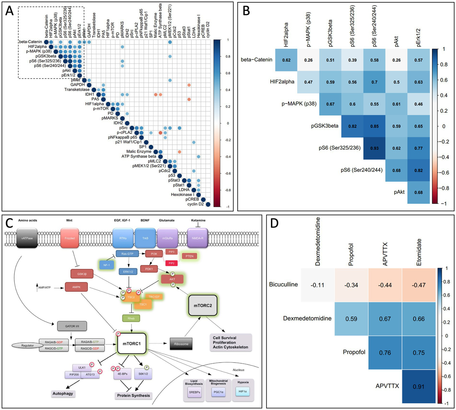 (A) Correlation matrix comparing all assays used in RPPA. For each assay on the RPPA matrix we calculated a correlation coefficient for every other assay against all pharmacological conditions and time points, and only significant correlations are shown (p < 0.05). The data was clustered using a non-supervised clustering algorithm to identify potential signaling modules. (B) A higher magnification of the signaling module outlined by the dashed box in (A), now superimposed with the corresponding correlation coefficient. (C) mTOR signaling pathway. A diagram from the mTOR signaling pathway showing that multiple members of the signaling module from (A,B) are involved in the mTOR pathway (from Lipton and Sahin, 2014, with permission). (D) Correlation matrix comparing the signaling module indicated in (A,B) across different pharmacological treatments. Propofol, etomidate, APV/TTX and dexmedetomidine modulate the signaling module from (A,B) in a correlated manner. Bicuculline activity on the signaling module indicated in (A,B) is anti-correlated with propofol, etomidate and APV/TTX.