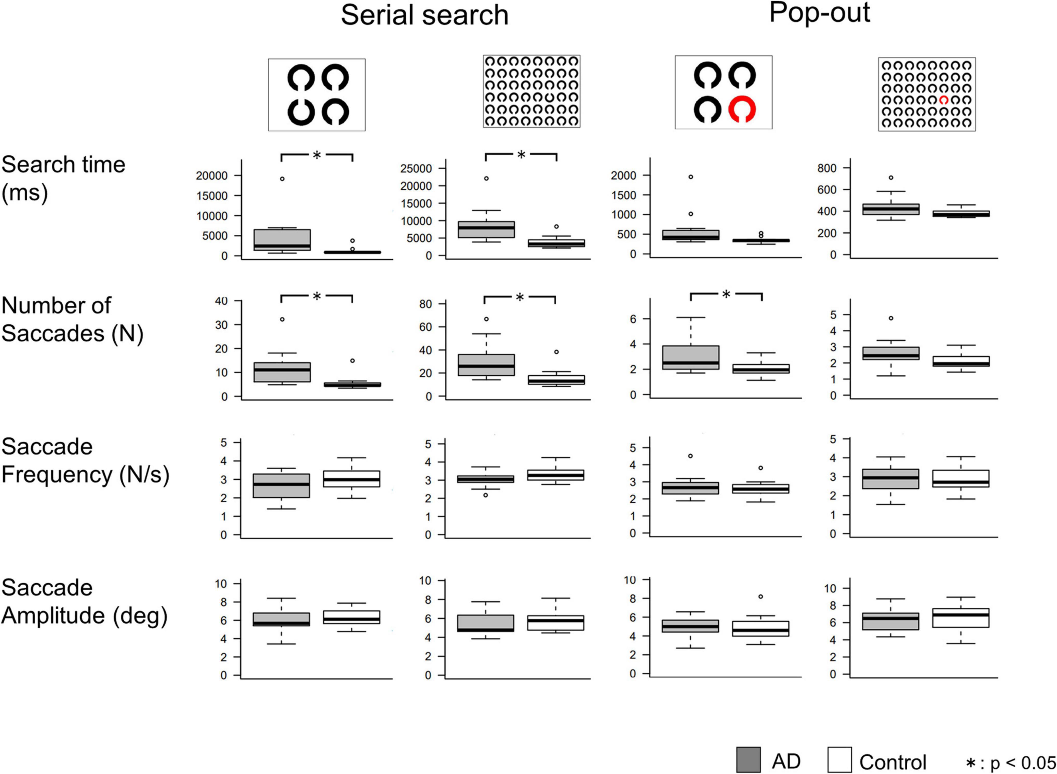 Methods: Sixteen AD patients (age: 79.1 ± 7.9 years, Mini Mental State Examination [MMSE] score: 17.7 ± 5.3, mean ± standard deviation) and 16 control subjects (age: 79.4 ± 4.6, MMSE score: 26.9 ± 2.4) participated. In the visual memory task, subjects memorized presented line drawings for later recall. In the visual search tasks, they searched for a target Landolt ring of specific orientation (serial search task) or color (pop-out task) embedded among arrays of distractors. Using video-oculography, saccade parameters, patterns of gaze exploration, and pupil size change during task performance were recorded and compared between AD and control subjects.