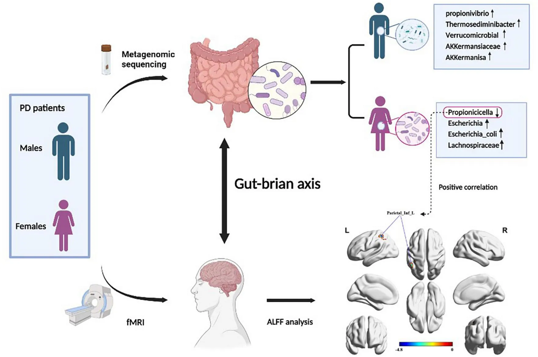 Based on the concept of the gut-brain axis, the present study combines the metagenomic analysis of gut microbiota with fMRI results to investigate whether gender differences in gut microbiota are present in PD patients and whether they correlate with brain activity. Taken together, this study will help to better investigate the role of gut microbiota in the pathogenesis and pathological changes of PD disease.