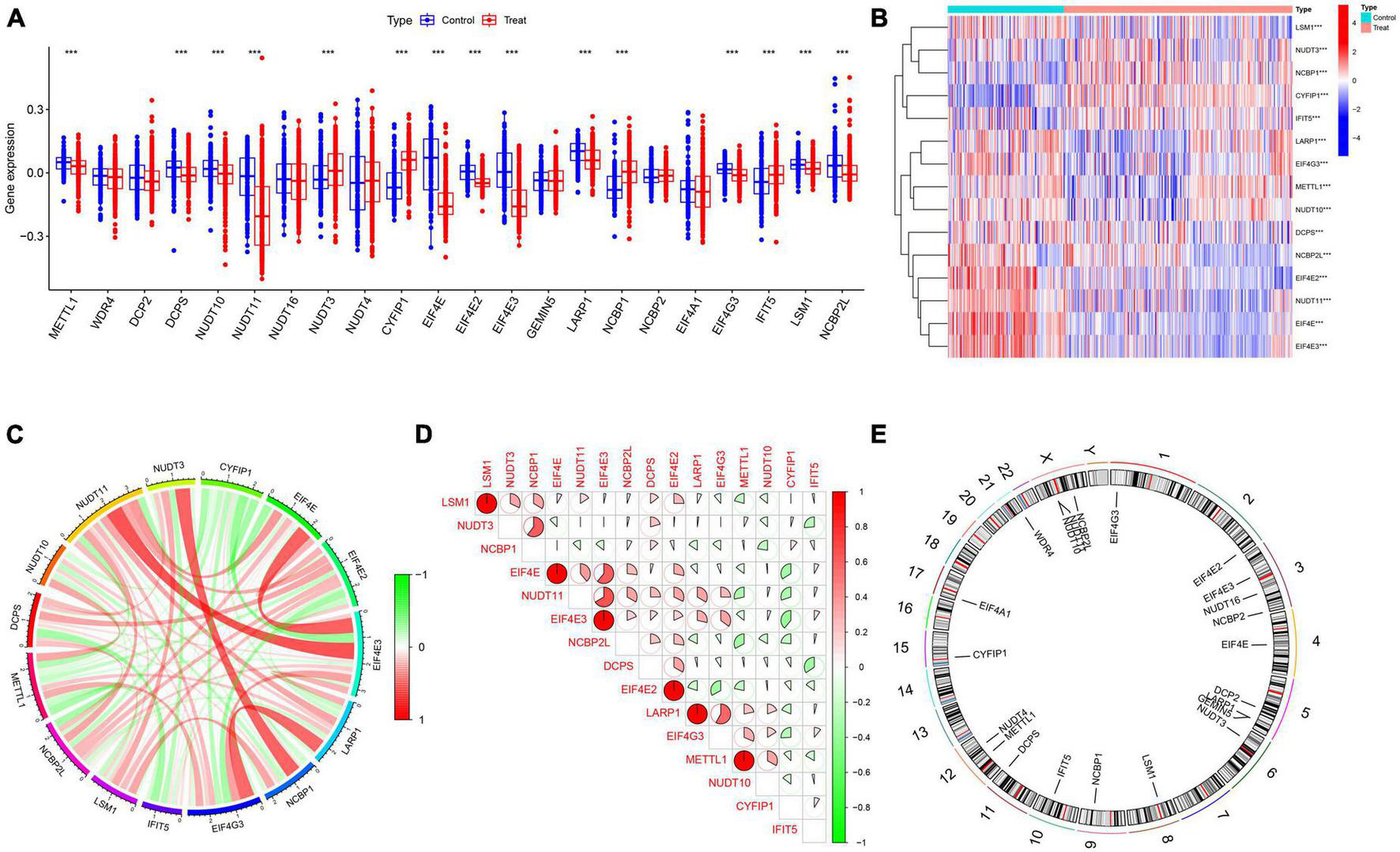 Identification of differentially expressed m7G-related genes. (A) Boxplots showed the expression of 22 M7RGs between AD and non-AD controls ***p < 0.001. (B) The expression patterns of 15 M7RGs were presented in the heatmap. (C) Interactions between 15 differentially expressed M7RGs at the molecular level. (D) Correlation analysis of 15 differentially expressed M7RGs. Red and green colors represent positive and negative correlations, respectively. The correlation coefficients were marked with the area of the pie chart. (E) The location of 22 M7RGs on chromosomes.