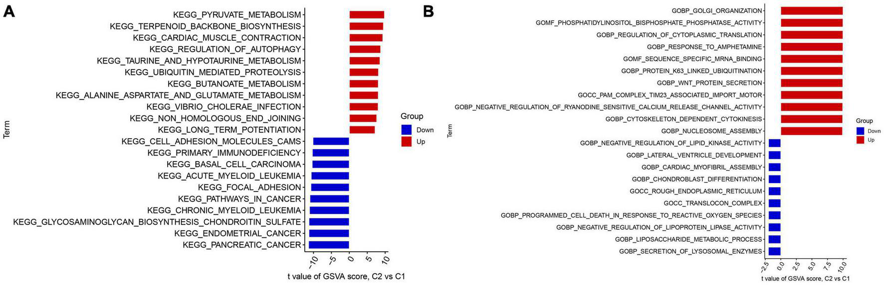 Identification of biological activities between two m7G clusters. (A) The KEGG pathway analysis. (B) The GO function analysis.