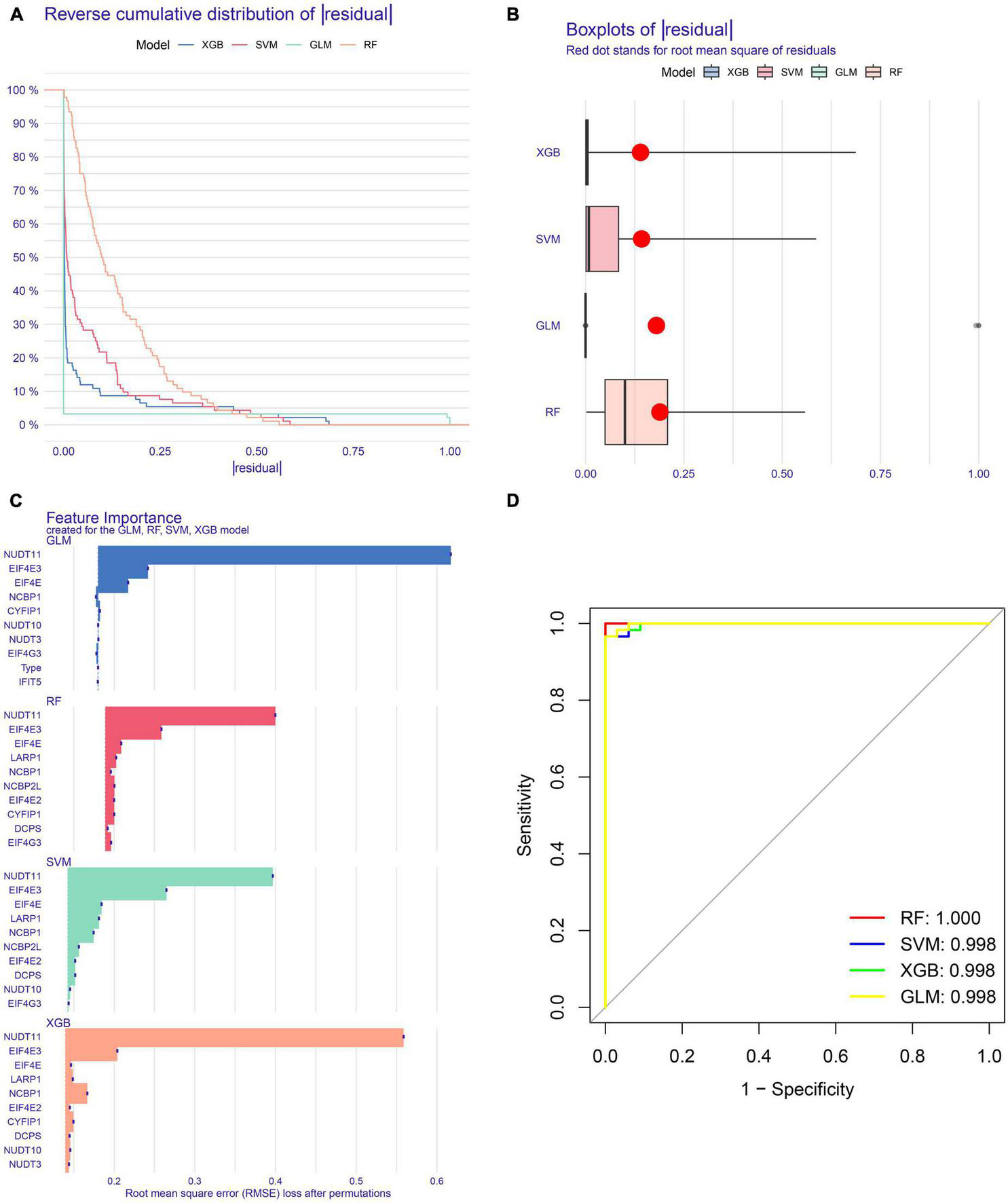 Construction and evaluation of RF, SVM, GLM, and XGB machine models. (A) Cumulative residual distribution of each machine learning model. (B) Boxplots showed the residuals of each machine learning model. Red dot represented the root mean square of residuals (RMSE). (C) The important features in RF, SVM, GLM, and XGB machine models. (D) ROC curves of four machine learning models based on fivefold repeated cross-validation in the testing cohort.