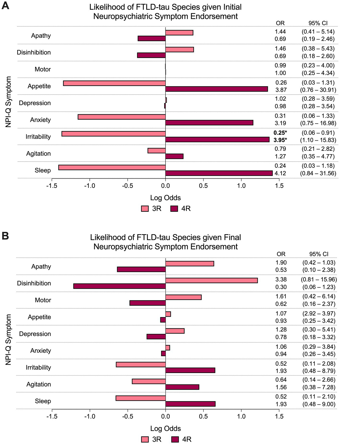 Odds of FTLD-tau species given neuropsychiatric symptom endorsement. (A) At initial visit, the odds of having a 4R FTLD-tauopathy at autopsy was significantly greater than the odds of having a 3R FTLD-tauopathy if irritability was endorsed. Other NPI-Q symptoms did not reliably predict FTLD-tau species at (A) initial or (B) final visit. Bars depict the log odds determined via logistic regressions controlling for disease duration at time of visit. Exponentiated odds ratios and 95% confidence intervals are presented to the right of the graph. Sample sizes are N = 27 4R FTLD-tau and N = 17 3R FTLD-tau. *p < 0.05.