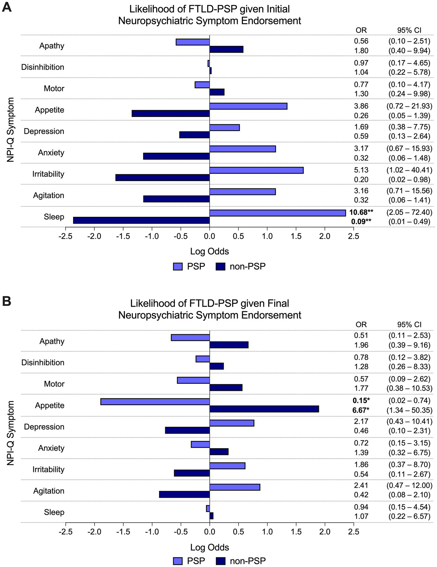 Odds of FTLD-PSP given neuropsychiatric symptom endorsement. (A) The odds of PSP pathologic diagnosis were significantly greater than other FTLD-tau subtypes (i.e., PiD and CBD) if sleep disturbance was endorsed at initial visit. Other individual NPI-Q symptoms did not reliably predict pathologic diagnosis of PSP (or other FTLD-tau subtype) at initial endorsement. (B) Endorsement of appetite disturbance at final visit predicted significantly lower odds of PSP pathologic diagnosis compared to non-PSP subtypes. Final endorsement of other neuropsychiatric symptoms did not reliably predict underlying PSP (or other FTLD-tau subtypes). Bars depict the log odds determined via logistic regressions controlling for disease duration at time of visit. Exponentiated odds ratios and 95% confidence intervals are presented to the right of the graph. Sample sizes are N = 10 FTLD-PSP and N = 34 FTLD-CBD or FTLD-PiD. *p < 0.05, **p < 0.01.