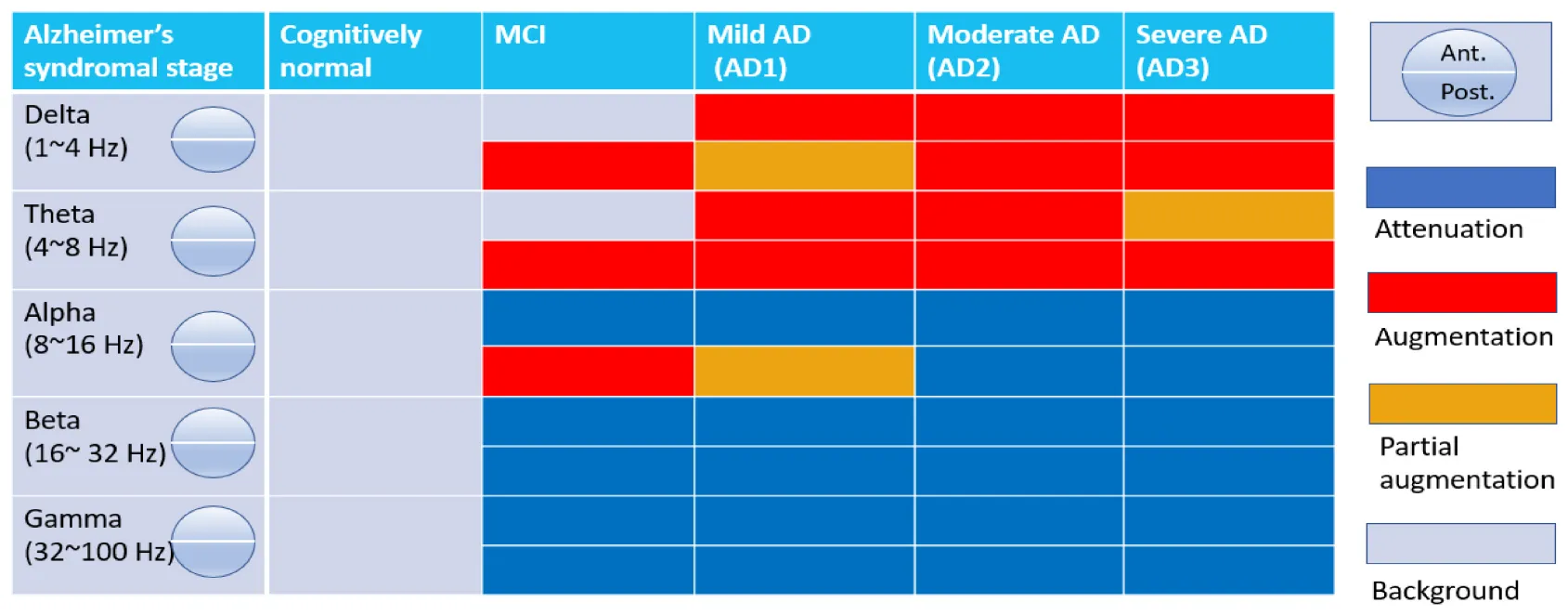 Overall, increasing AM power of LFO became more prominent with disease progression. Decreasing AM power of HFO emerged earlier during MCI, which was sustained along the disease course. Alpha band oscillations functioned as a transitional zone, revealing increasing AM power in posterior regions but reducing AM power in anterior regions in MCI. With disease progression, the alpha band exhibited more widespread decreasing AM power, especially in AD2.