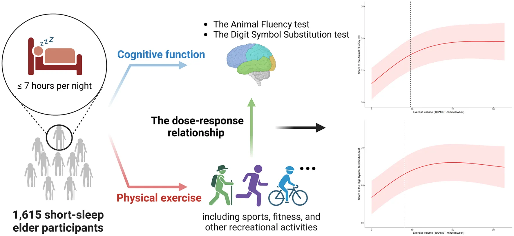 According to our research, the benefit of exercise did not always expand with the exercise volume increment under the short-sleep condition, which challenged existing knowledge. The short-sleep elder group could maintain cognitive performance with no more than 800 MET-minutes/week of physical exercise. Verification of these findings requires further biological investigations.
