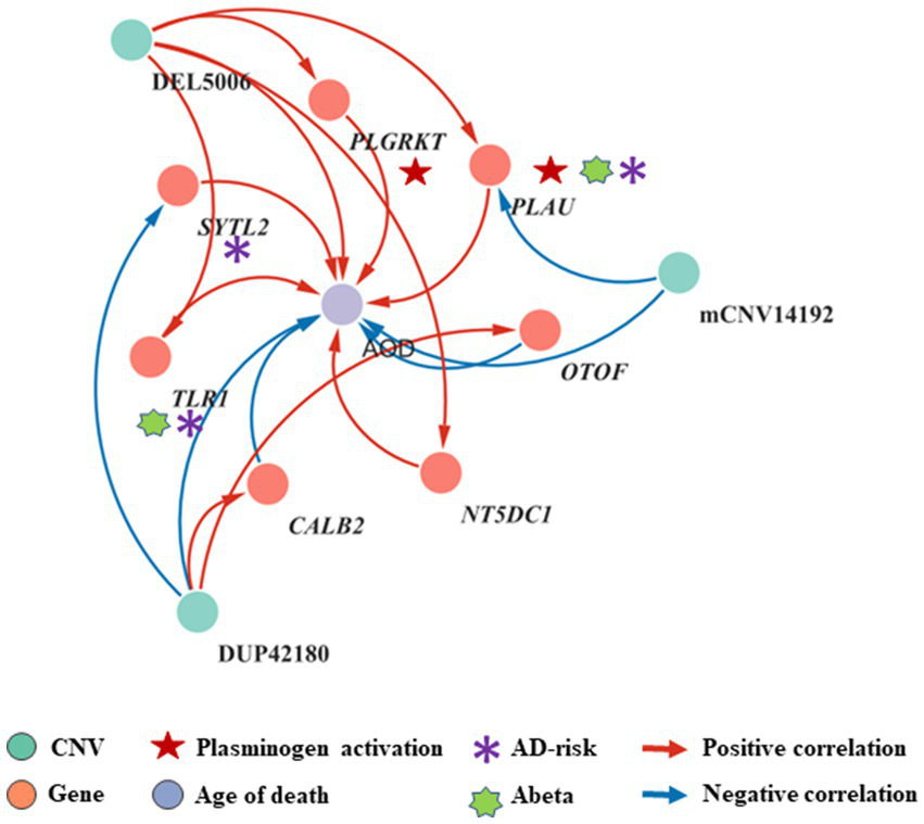 To estimate the likelihood of the two scenarios, we utilized the Causal Inference Test (CIT) (Millstein et al., 2016). We choose the scenario with more significant FDR as the more likely scenario. Eventually, we identified three AOD-correlated CNVs that regulated seven genes and affected AOD, which were used to construct the causality network. The correlation pairs between these genes and CNVs were defined as edges that linked their corresponding nodes in the network. We utilized Cytoscape (version 3.9.1) to visualize the network. In the network diagram, turquoise blue, tangerine pink, and lavender purple circles represent CNVs, genes, and age of death, respectively. The red star symbol indicates the gene that was enriched for the plasminogen activation pathway, while the purple asterisk represents the AD-risk genes. The red and blue edges represent positive and negative correlations, respectively. In the causality network, arrows are used to indicate the direction of causality.