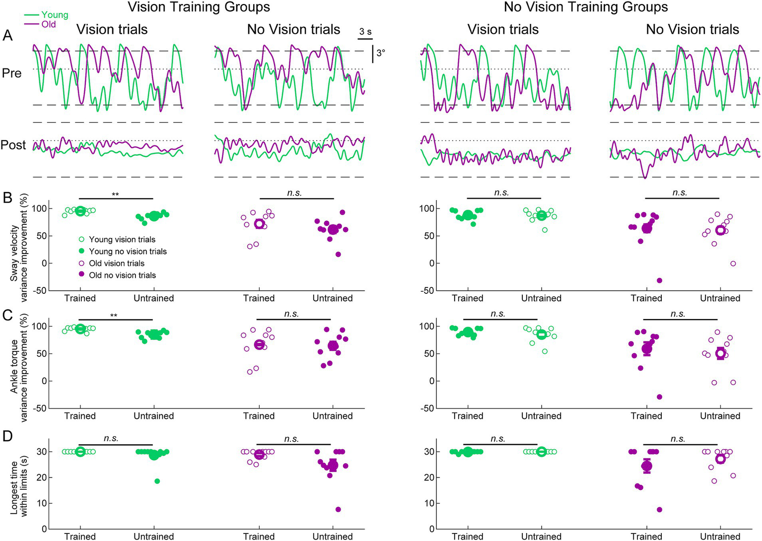 Standing balance behavior with imposed 250 ms delay in pre-and post-learning trials. (A) Whole-body angular position (°) from representative participants from all groups. Dashed lines represent the virtual position limits (6° anterior, 3° posterior) and the dotted lines represent 0°. For all panels, data in green represents young adults and data in purple represents old adults. (B) Sway velocity variance percentage improvements between pre-and post-learning trials from all groups. (C) Ankle torque variance percentage improvements between pre-and post-learning trials from all groups. (D) Longest time within balance limits in the pre-and post-learning trials. Pre-and post-learning delay trials were 30 s in length, resulting in a maximum value of 30 s for time within limits. For (B–D), small circles are individual participants and large circles are group averages (n = 10 for each group) with SEMs. Open circles represent vision trials and closed circles represent no vision trials. Regardless of which visual condition was trained (vision or no vision), balance improvements were observed for both vision and no vision balance conditions. A significant difference between trained and untrained conditions indicates that the improvement percentages across trained and untrained visual conditions were equivalent. ** indicates p < 0.01, n.s. indicates not significant.