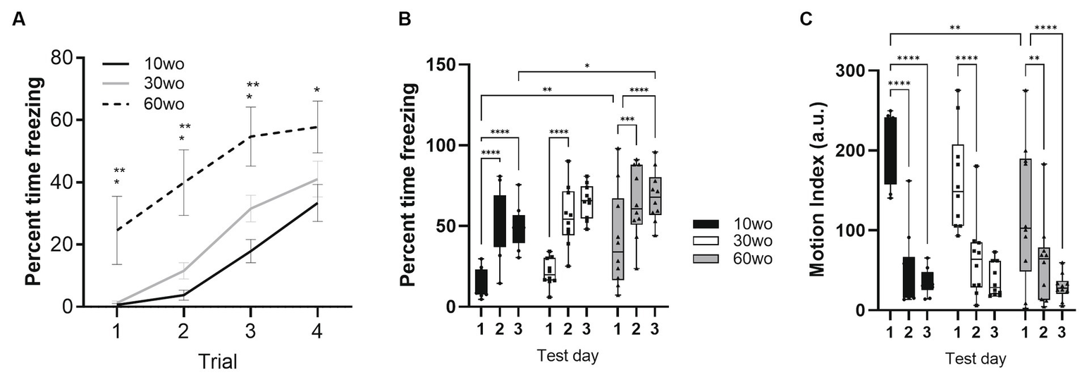 Videos were acquired at 30 frames per second (fps) and the minimum freeze duration was 30 frames. For training on the first day, a 180 s baseline was followed by four presentations of a 20 s tone (90 dB, 5 kHz, 50 ms risetime) with the presentation of moderate level current to the entire grid floor for 1 s (0.9 mA; inescapable shock) on the final second before the tone ended. This 90 dB tone is above the auditory brainstem response measured in C57BL/6 J mice, which declines with age and reaches 60–80 dB at 5–8 kHz (Henry, 2004; Yu et al., 2011; Youn et al., 2020). Each of the four tone-shock presentations were separated by 190 s and the entire session lasted 17 min. On days 2 and 3 (recall tests at 24 and 48 h of training day 1, respectively), the same protocol was carried out but in the absence of a shock. On day 3 (modified context test), the cage environment was modified by placing a plastic smooth white floor and diagonal walls, which covered the grid floor, light, and speaker.