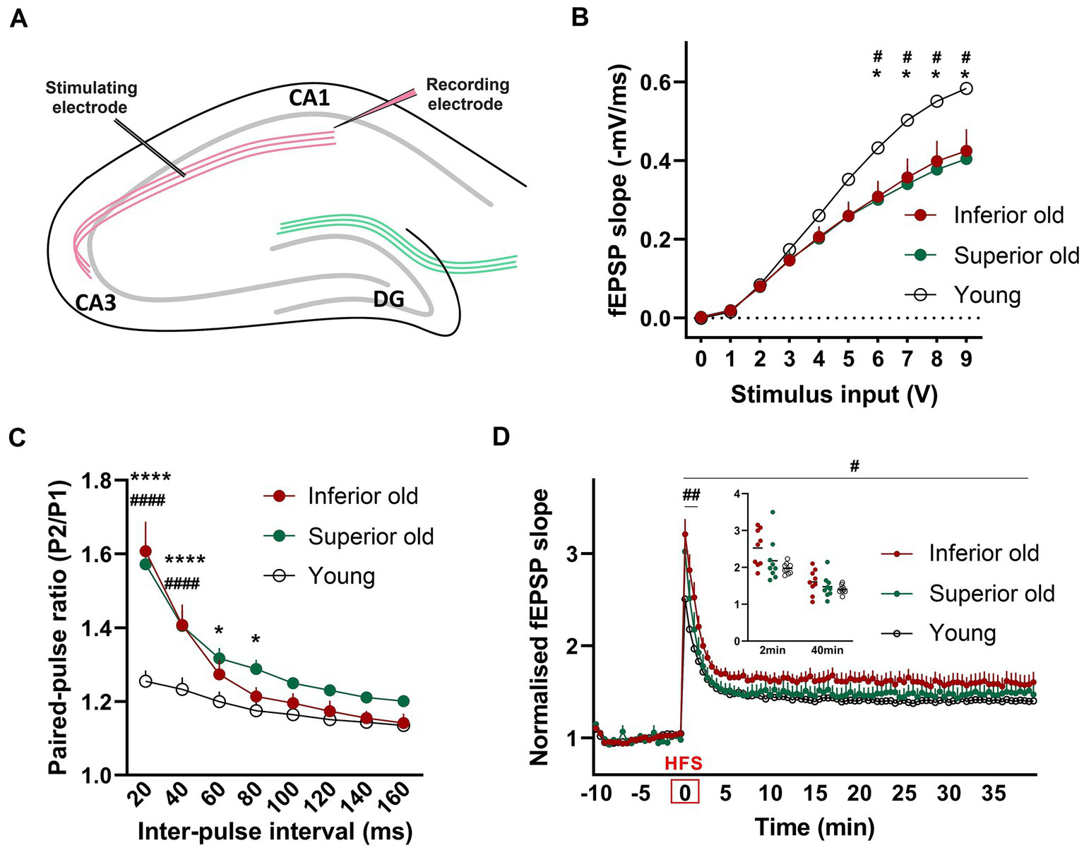 (A) For field potential recordings from hippocampal slices, the stimulating electrode was placed in the Schaffer collateral axons of CA3 and a recording electrode in the Stratum radiatum of CA1 (B) Input/output (I/O) responses were significantly shifted downward in hippocampal slices from Superior and Inferior performing aged rats. Two-way RM-ANOVAwith Tukey’s post-hoc test. (C) Enhanced paired-pulse facilitation in aged animals. Data represent the ratio of the second fEPSP slope to the first fEPSP slope. Two-way ANOVA with Tukey’s post-hoc test. (D) Potentiation induced after high-frequency stimulation (HFS) was significantly enhanced immediately after HFS (first 2 min) and over 40 min of recording in Inferior old rats compared to Young. Two timepoints (2 min and 40 min) are shown as a dot plot. Two-way RM-ANOVA. * Superior old vs. Young, # Inferior old vs. Young. Data are expressed as a mean ± s.e.m., n = 9 per group, #/*p < 0.05, ##p < 0.01, ####/****p < 0.0001.