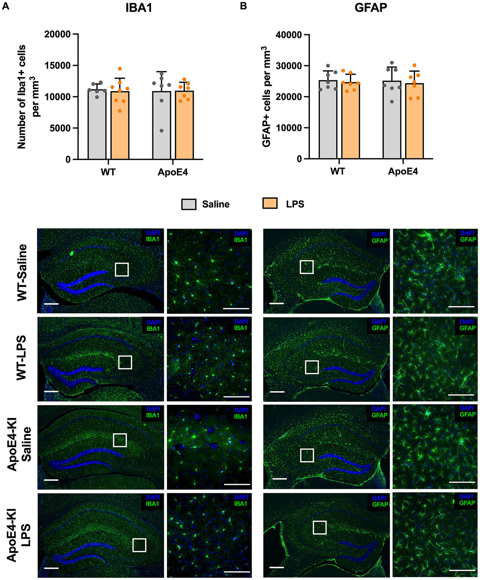 Unaltered glial cell activation profile: (A) Stereological quantification of Iba1+ microglial cells and (B) GFAP+ astroglial cells in the dorsal hippocampal. All values represent the Mean ± Standard Error of the Mean (SEM). WT Saline = 6, WT LPS = 8, ApoE4 Saline = 7, ApoE4 LPS = 7. Scale bar: 250 μm zoomed out and 100 μm zoomed in images.