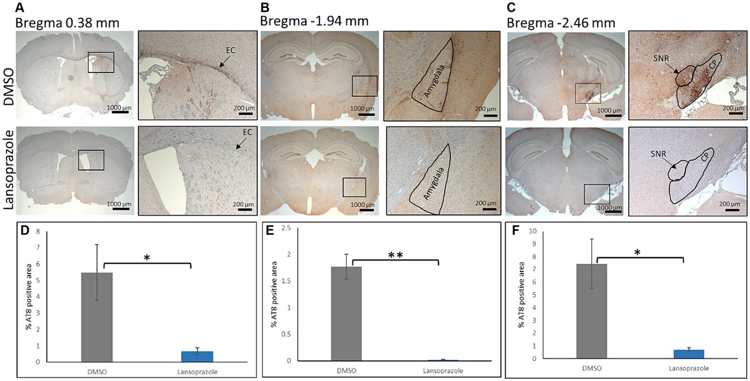 Figure 5. Lansoprazole treatment attenuated the phosphorylated tau pathology. At the bregma 0.38 mm (A), the external capsule (EC) showed the highest AT8 immunoreactivity on the ipsilateral side. At the bregma-1.94 mm (B), the amygdala showed strong AT8 immunoreactivity in the DMSO-treated group. At the bregma-2.46 mm (C), the substantia nigra, reticular region (SNR), and cerebral peduncle (CP) showed strong AT8 immunoreactivity. (D–F) show quantification bar graphs of the percentage of AT8-positive areas in the EC and caudate putamen (A), amygdala (B), and (C) (CP and SNR) respectively. AT-positive areas in the EC, SNR and CP were smaller in the lansoprazole-treated group. Insets in the left panels represent the right panels in (A–C) * indicates p < 0.05, ** indicates p < 0.01 Bar = 200 mm.