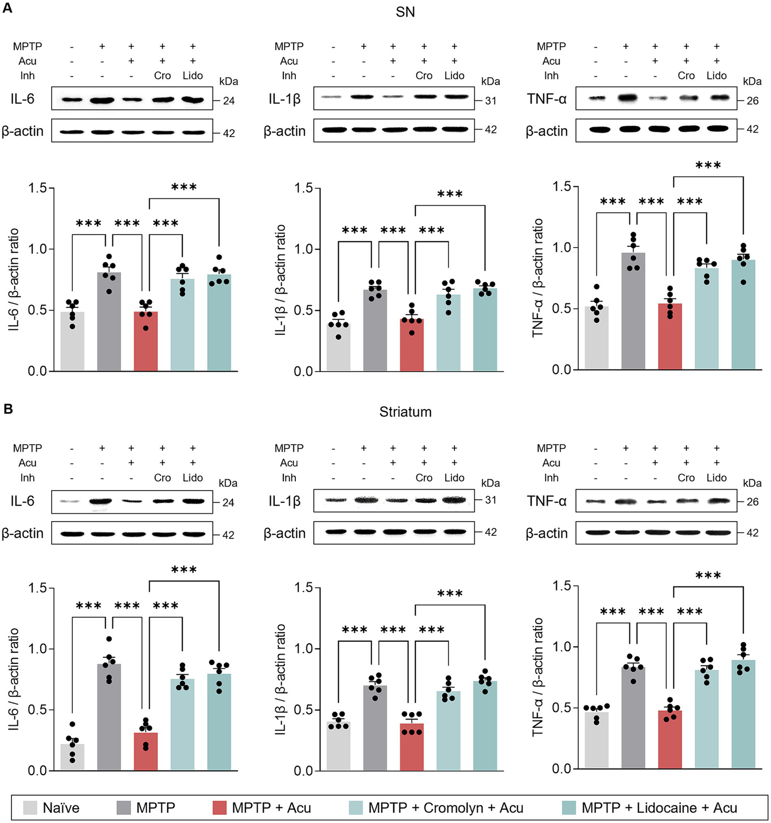Peripheral MCs and nerves associated with inhibitory effects of acupuncture on inflammatory cytokines in PD mice. (A) Representative bands of IL-6, IL-1β, and TNF-α, as well as their quantification by western blotting analysis in the SN. (B) Representative bands of IL-6, IL-1β, and TNF- α, as well as their quantification by western blotting analysis in the striatum. ***p < 0.001. n = 6 per group. All data are presented as mean ± SEM.