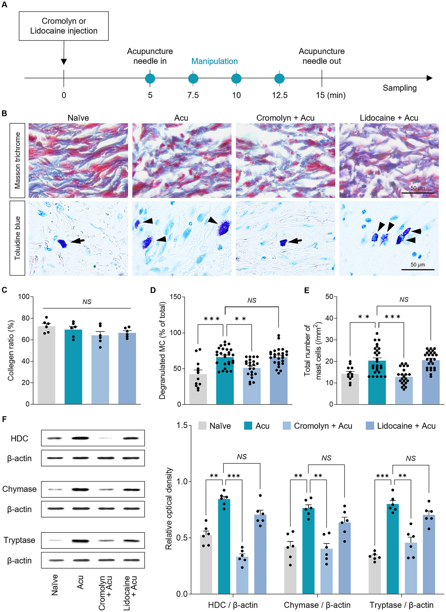 Peripheral MCs are upstream than nerves in the effects of acupuncture starting from acupoints. (A) Experimental timeline for identifying the causal relationship between MCs and nerves in acupoints. (B) Representative images of masson trichrome and toluidine blue staining in acupoints. (C) Collagen morphology and collagen ratio after acupuncture stimulation (n = 6 per group). (D,E) Quantification of number and degranulated peripheral MCs (N = 6 mice and n = 12–27 cells per group). (F) The expression levels of markers of MC degranulation by acupuncture stimulation in acupoints (n = 6 per group). ***p < 0.001, **p < 0.01, *p < 0.05. All data are presented as mean ± SEM.