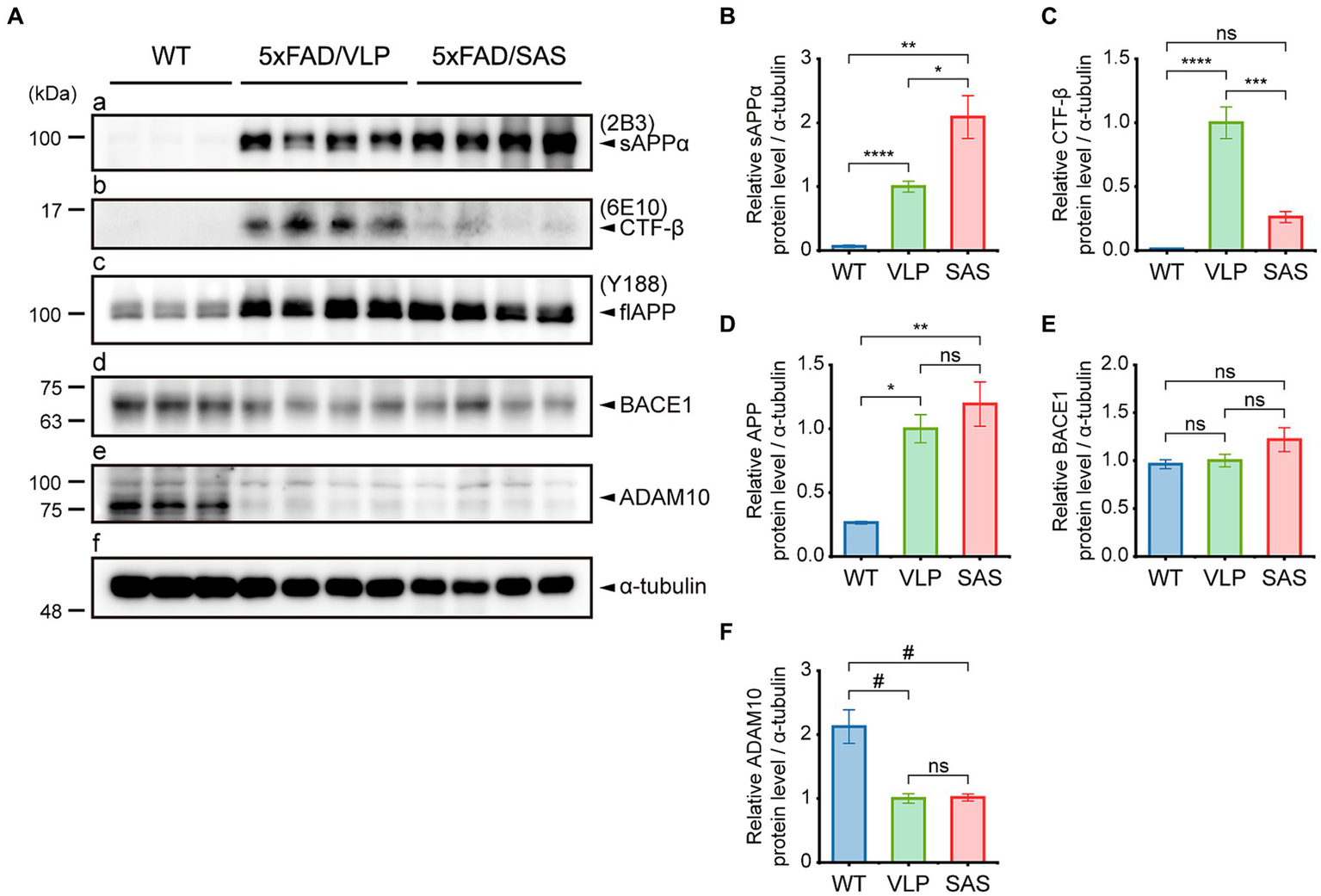 SAS enhances the non-amyloidogenic processing of APP in the 5xFAD mice. (A) Hippocampal extracts from the 5xFAD and age-matched WT mice were analyzed by western blotting. Representative blots are shown. Products of APP processing (sAPPα and CTF-β) and full-length APP were detected by the 2B3, 6E10, and Y188 antibodies, respectively. Endogenous proteases (BACE1 and ADAM10) associated with APP processing were detected by an anti-BACE1 antibody and an anti-ADAM10 antibody, respectively. α-tubulin was used as a loading control. (B–F) Western blotting results were quantified and statistically analyzed (normalized by the amount of α-tubulin). (B) Densities of sAPPα (Brown-Forsythe ANOVA followed by Dunnett’s T3 post-hoc test: WT vs. 5xFAD/VLP, p < 0.0001; WT vs. 5xFAD/SAS, p = 0.0015; 5xFAD/VLP vs. 5xFAD/SAS, p = 0.0376), (C) CTF-β (one-way ANOVA followed by Bonferroni’s post-hoc test: WT vs. 5xFAD/VLP, p < 0.0001; WT vs. 5xFAD/SAS, p = 0.5124; 5xFAD/VLP vs. 5xFAD/SAS, p = 0.0001), (D) full-length APP (Brown-Forsythe ANOVA followed by Dunnett’s T3 post-hoc test: WT vs. 5xFAD/VLP, p = 0.0008; WT vs. 5xFAD/SAS, p = 0.0067; 5xFAD/VLP vs. 5xFAD/SAS, p = 0.7558), (E) BACE1 (one-way ANOVA: ns, no significance), and (F) ADAM10 (one-way ANOVA followed by Bonferroni’s post-hoc test: WT vs. 5xFAD/VLP, p < 0.0001; WT vs. 5xFAD/SAS, p < 0.0001; 5xFAD/VLP vs. 5xFAD/SAS, p > 0.9999) were analyzed. WT, wild type; VLP, 5xFAD/VLP; SAS, 5xFAD/SAS. *p < 0.05, **p < 0.01, ***p < 0.005, ****p < 0.001, #p < 0.0005, and ##p < 0.0001. Each bar and error bar represents the mean ± standard error of the mean (SEM). Male mice were used (WT, n = 3; 5xFAD/VLP, n = 8; 5xFAD/SAS, n = 8).