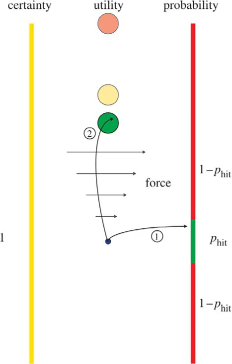 A model of motor decision-making has been proposed that accounts for the inherent uncertainty in movement planning and execution in addition to biomechanical costs such as effort (Trommershäuser et al., 2003a). To test this model, partially overlapping target and penalty areas were presented on a screen. A reaching movement that ended in the target circle yielded reward points, whereas the penalty circle led to a loss. A prediction was made for each individual’s optimal movement endpoint that would maximize reward while accounting for their natural movement variability. This prediction was compared to their actual chosen endpoints. Actual decisions closely matched those of an “optimal performer” suggesting that people accurately take both their own movement variability or uncertainty as well as explicit costs into account when making decisions for such pointing tasks (Trommershäuser et al., 2003a).
