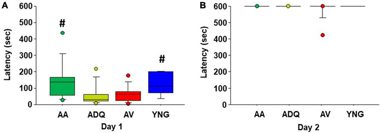 One week following spatial watermaze training, an inhibitory avoidance test was conducted. A Kruskal–Wallis one-way ANOVA indicated a group difference (H = 10.53, p < 0.05) in the latency to cross into the dark chamber on the training day (day 1). Post hoc Mann–Whitney U tests indicate that the latency to enter the dark compartment was increased for AA and YNG relative to ADQ and AV (Figure 5A). Kruskal–Wallis test for latency to the dark chamber on the retention testing day was not significant (Figure 5B).