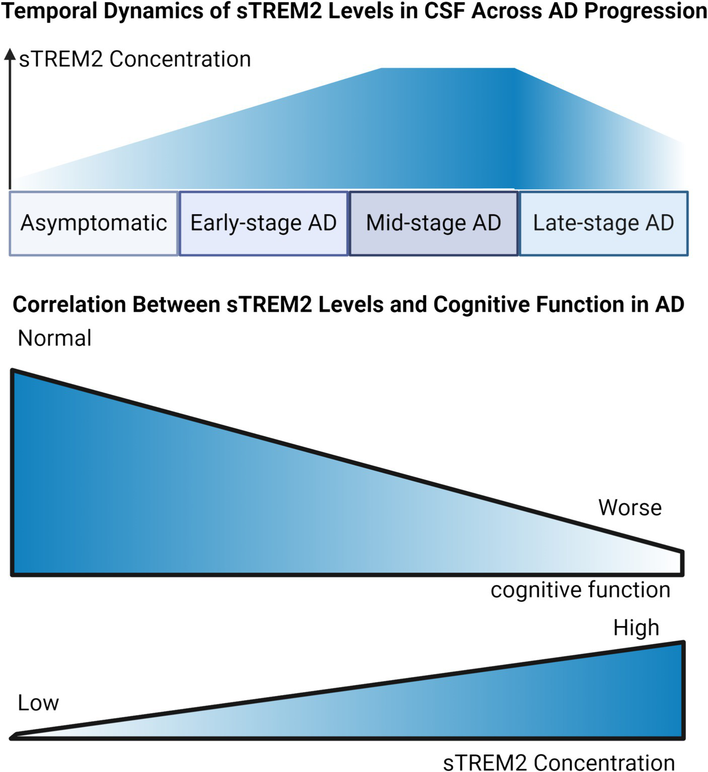 Dynamic Trends of sTREM2 Levels in Alzheimer’s Disease Progression. Temporal Dynamic of sTREM2 Levels in CSF Across AD Progression: Illustrating the trend of sTREM2 levels, the graph depicts an ascending trajectory against the stages of AD from asymptomatic to late-stage. It suggests an initial increase in sTREM2 concentration, which peaks during the early symptomatic phases, corresponding to heightened microglial activation, followed by a plateau or potential decrease in the late stages of AD. Correlation Between sTREM2 Levels and Cognitive Function in AD: Serving as a focused examination of the sTREM2-MMSE correlation, this graph presents a direct association between increased sTREM2 levels and changes in MMSE scores. It highlights how elevated sTREM2 levels are potentially linked with cognitive stability or decline, thereby reflecting their significance as a biomarker within the AD diagnostic spectrum.