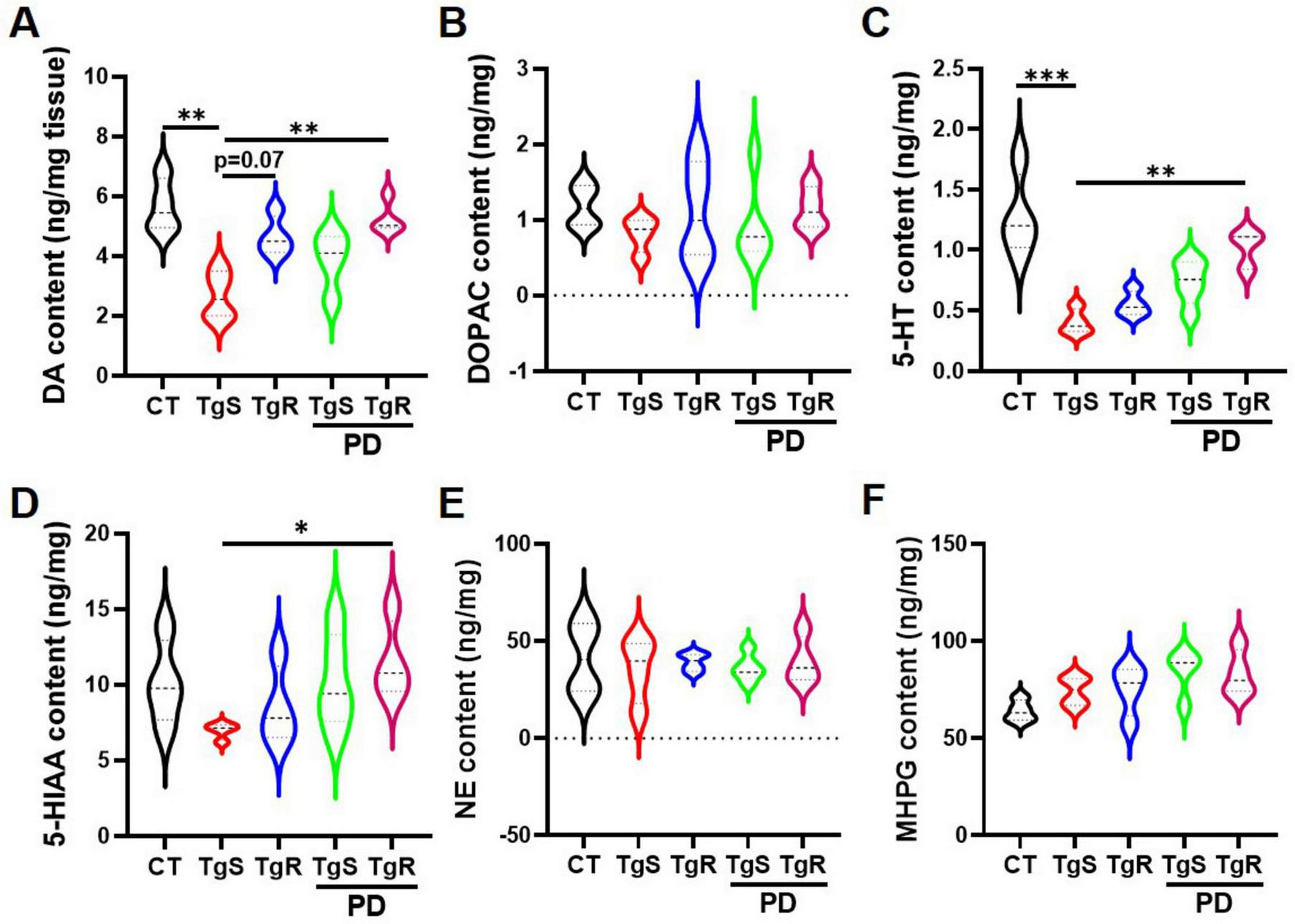 Figure 5. PD and voluntary running modulated monoamine neurotransmitters in the hippocampus. (A–F) Contents of DA, DOPAC, 5-HT, 5-HIAA, NE, and MHPG determined by HPLC analysis. *p < 0.05, **p < 0.01, ***p < 0.001 vs. TgS group. The Kruskal–Wallis test followed by Dunn’s post-hoc test was used (mean ± SEM, n = 4).