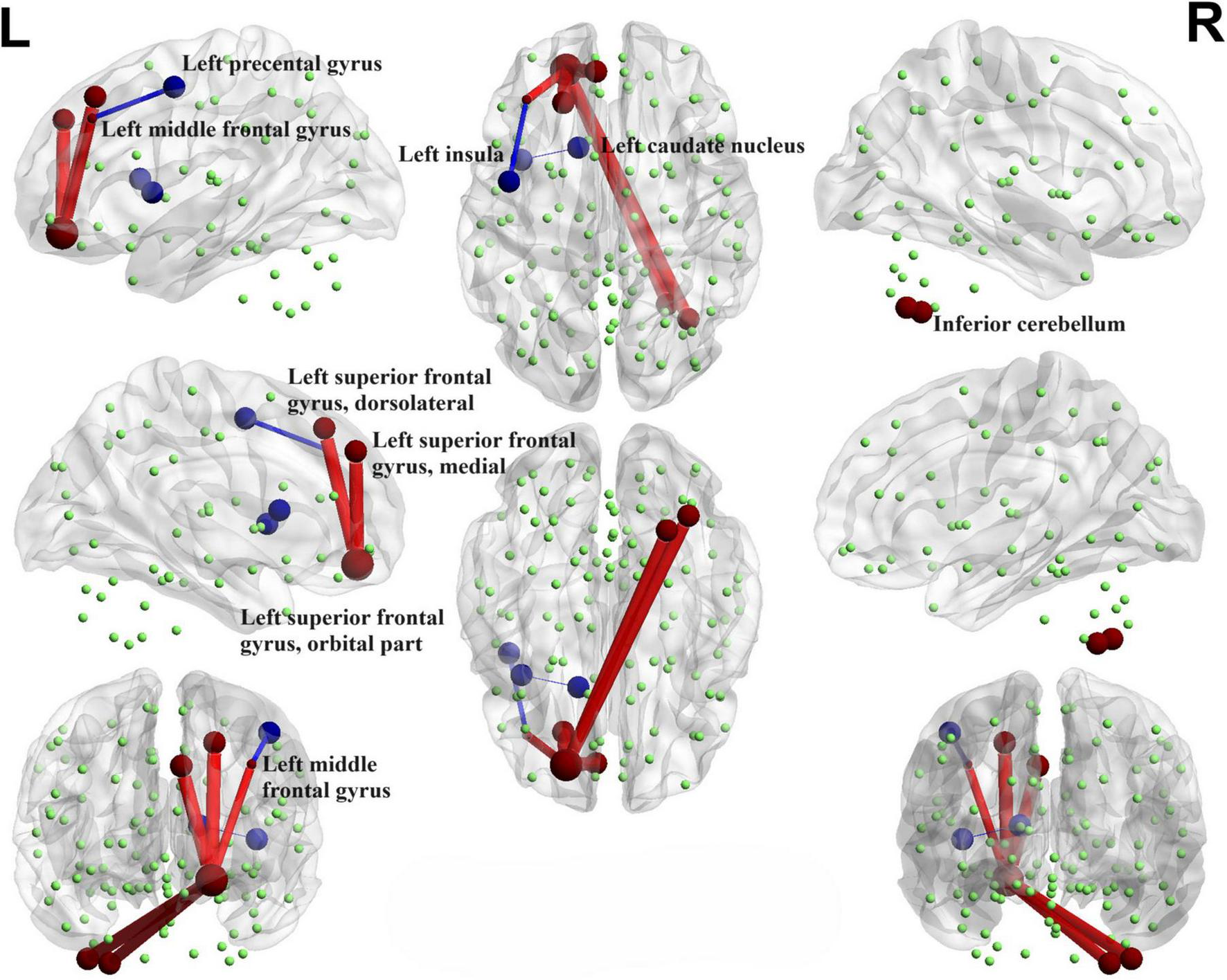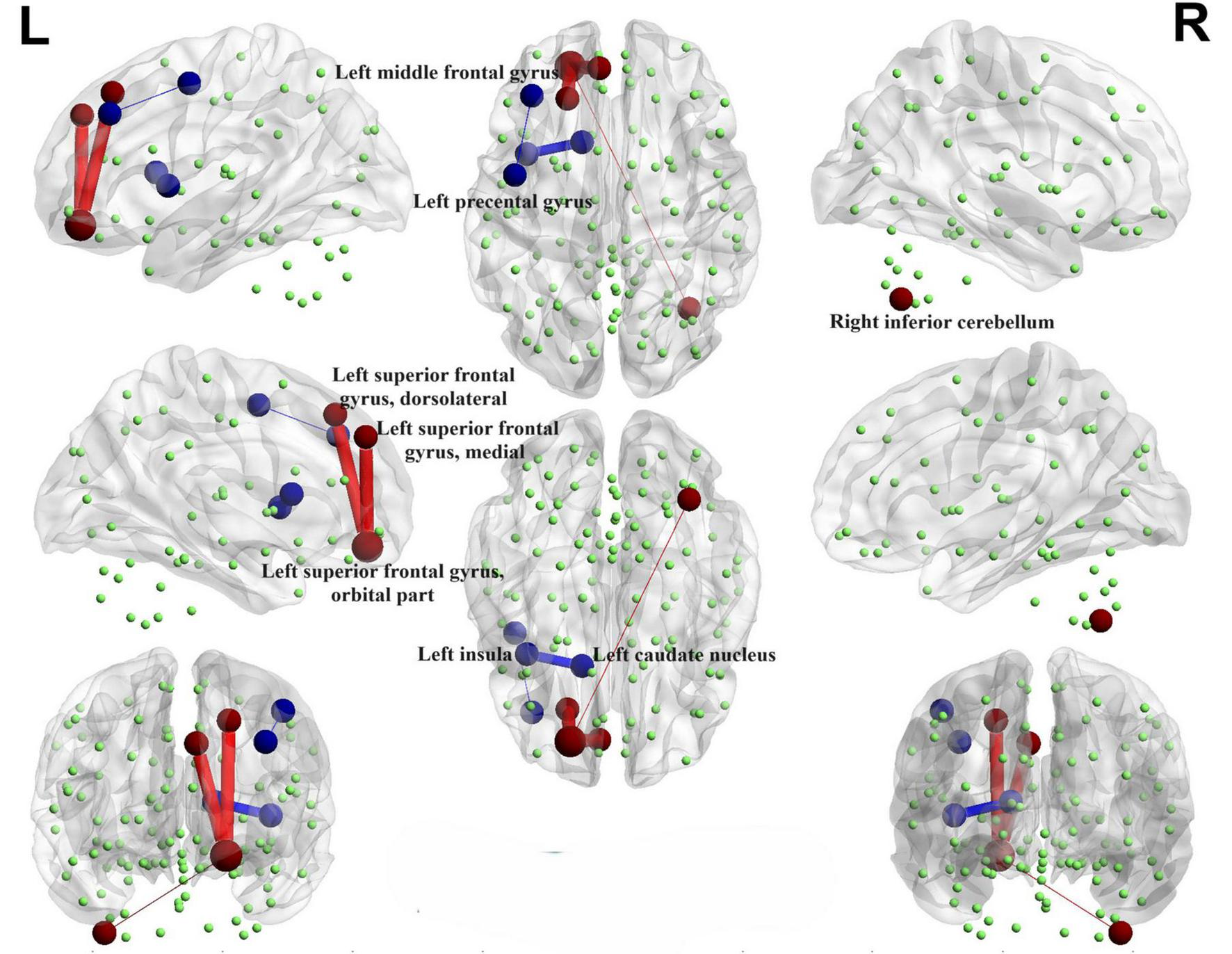 Functional connectivity alterations between the PD-SH group and the HC group. The spheres represent brain nodes, where red spheres and connecting lines signify strengthened functional connectivity, while blue indicates a decrease in functional connectivity. R, right; L, left.