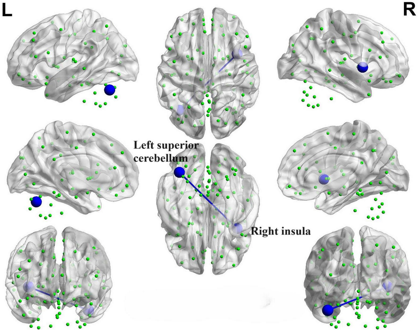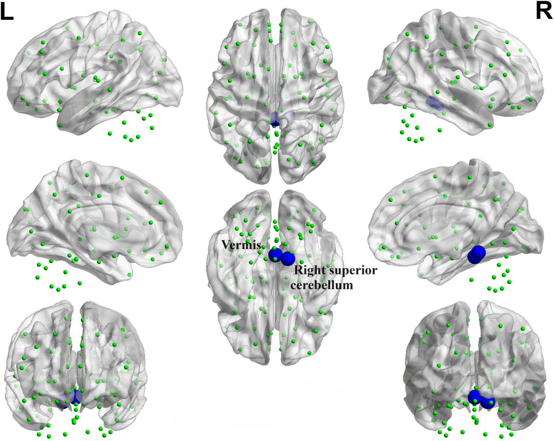 Decreased functional connectivity between the right superior cerebellum and the vermis of the PD-SH group in comparison to the PD-N/MH group. The blue spheres and connecting lines signify decreased functional connectivity. R, right; L, left.