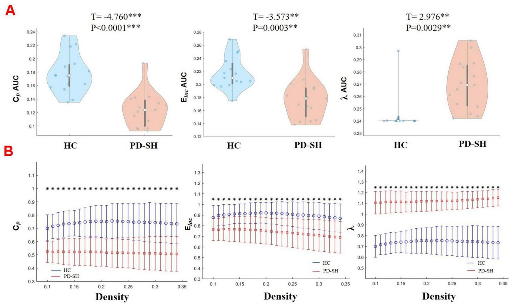 Differences in network topological properties among the PD-SH, PD-N/MH, and HC groups. (A) Violin plots depict the distribution of mean Cp AUC, Eloc AUC and λ values, highlighting the contrast between PD-SH and HC. (B) Cp, Eloc and λ values are shown across a density range spanning from 10 to 34%. Each point, accompanied by an error bar, represents the mean and standard deviation at specific density levels, respectively. The asterisk indicates the significant difference levels. ** denotes P < 0.01; *** denotes P < 0.0001.