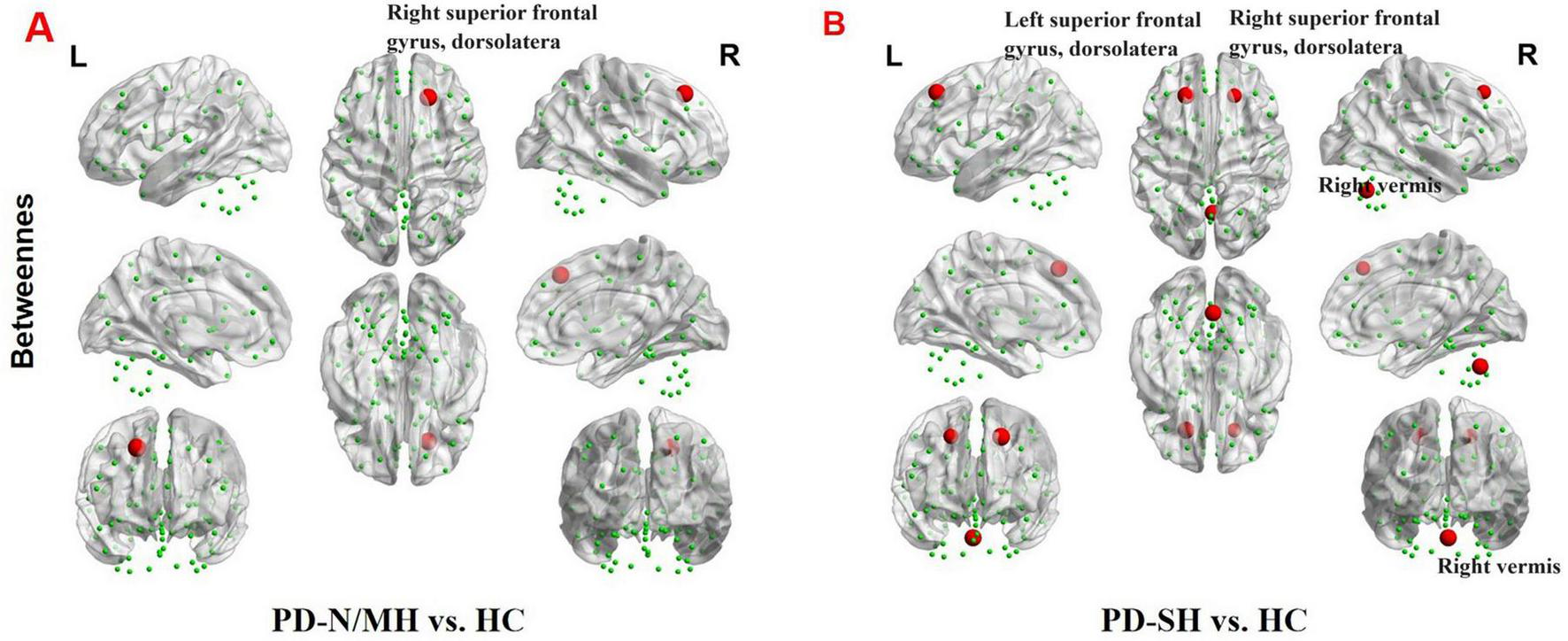 The brain regions with statistically significant difference in betweenness centrality among PD-SH, PD-N/MH an HC group. (A) The difference in betweenness centrality between the PD-N/MH and HC group. (B) The difference in betweenness centrality between the PD-SH and HC group. The red spheres represent the brain nodes with increased betweenness centrality in PD-N/MH or PD-SH compared to HC group. R, right; L, left.