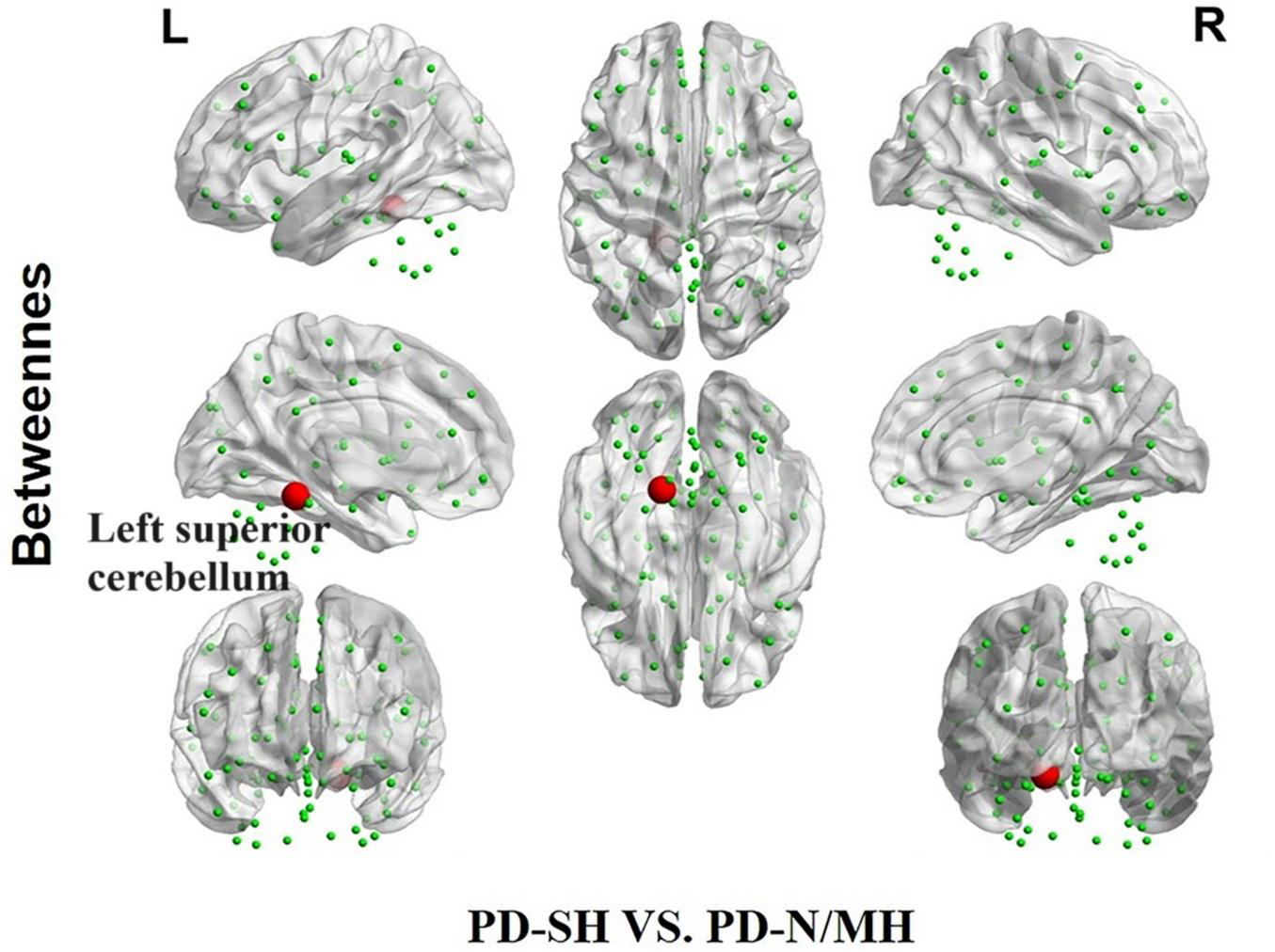 The difference in betweenness centrality between the PD-SH and PD-N/MH group. The red spheres represent the brain nodes with increased betweenness centrality in PD-N/MH compared to PD-SH group. R, right; L, left.