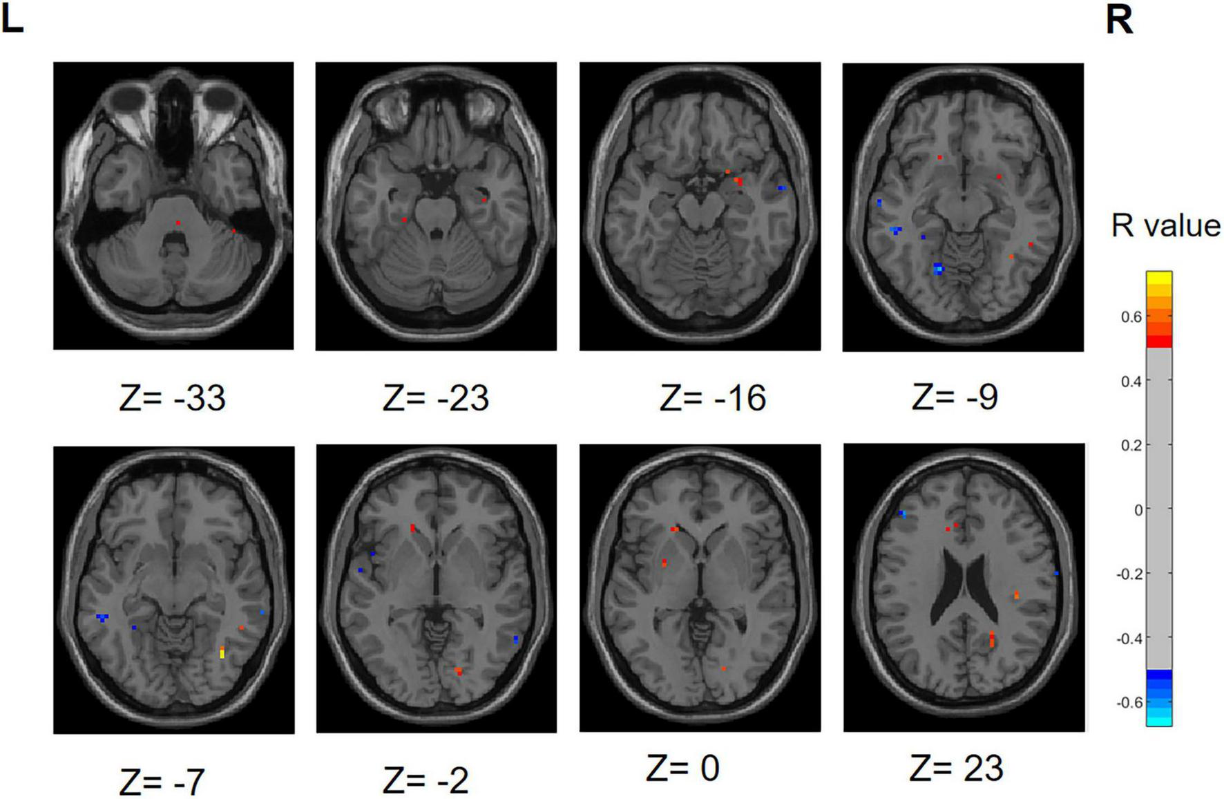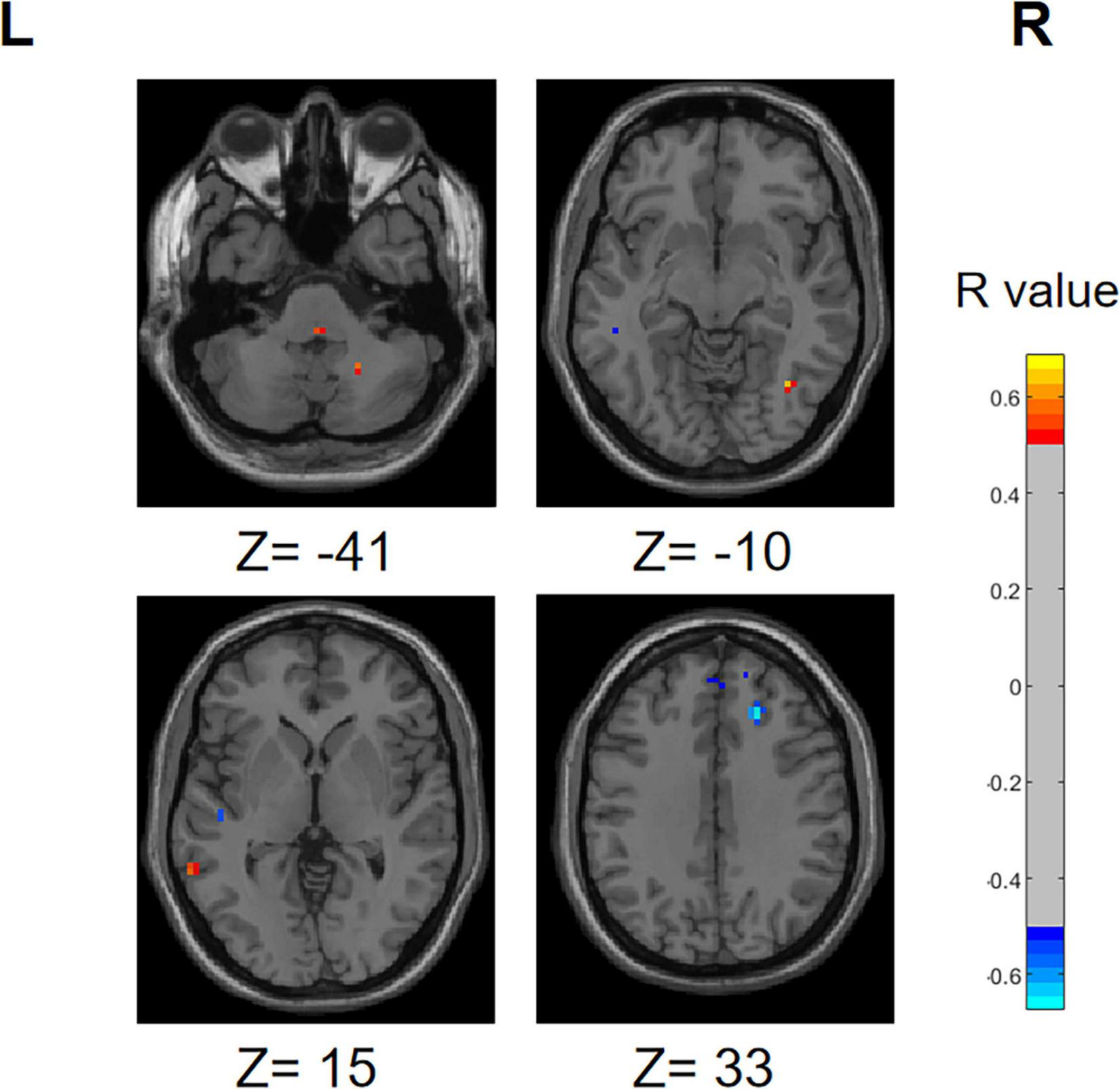 Before high-pass filtering was applied, the ALFF was computed using the DPABI software (Yan and Zang, 2010), utilizing the preprocessed dataset. This involved converting the time series data of each individual voxel into a frequency spectrum using the Fourier transform. Then the amplitudes within the frequency range of 0.01–0.1 Hz were summed to calculate the ALFF (Yang et al., 2023; Zuo et al., 2010; Lv et al., 2018). The analysis of variance (ANOVA) was conducted for ALFF in three groups, and the Tukey honest significant difference (HSD) method was used to correct the errors between pairwise comparisons, with age and gender as covariates. A rigorous correction for multiple comparisons was applied at the clump level in this study to minimize the false-positive rates. And the present study then reveals the surviving corrected clumps.