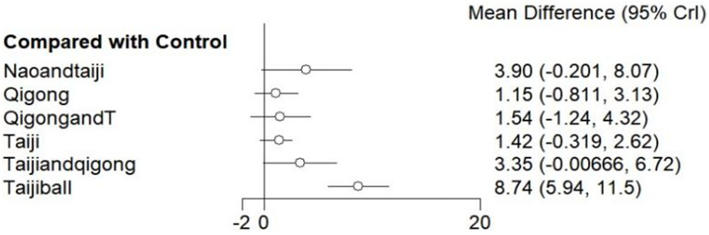 The results of network meta-analysis showed that compared with the control group, Taijiball [RR = 8.74, 95% CI (5.94, 11.53), p < 0.05] had a significant advantage (Figure 5; Supplementary Table 4) The top three SUCRA rankings were as follows: Taijiball (0.992), Nao Ling Tang, and Tai Chi (Naoandtaiji) (0.703), and Taijiandqigong (Tai Chi Qigong is organized by combining Yang-style and Wu-style Tai Chi with Ba Duan Jin Qigong, Wu Qin Xi Qigong, and Liu Zi Jue Qigong) (0.670) (Table 2).