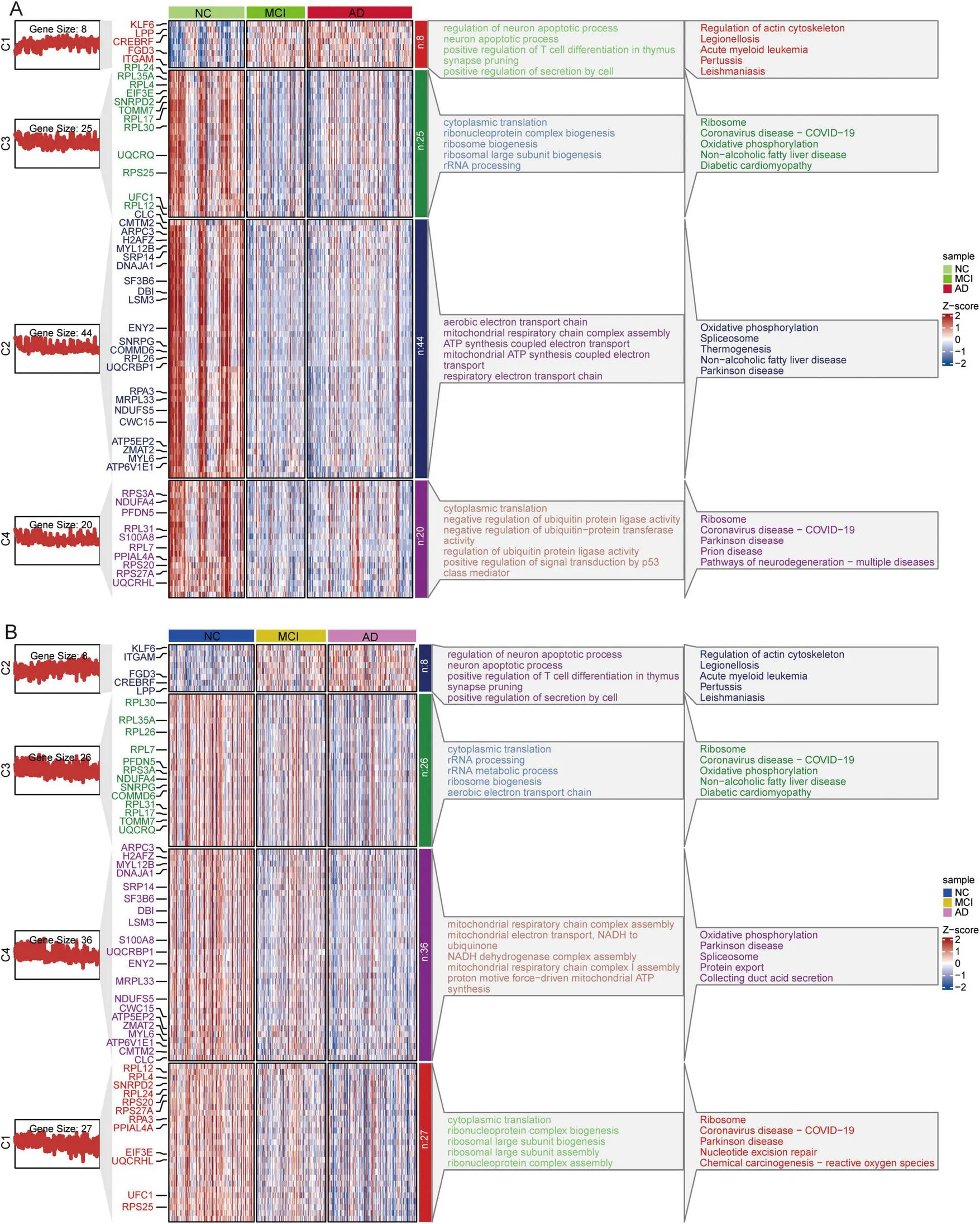 Cluster heatmap analysis of common DEGs in GSE63060 (Figure 10A) and GSE63061 (Figure 10B) revealed that the genes upregulated in AD progression were mainly involved in the regulation of neuronal apoptotic processes and the actin cytoskeleton. In contrast, the genes downregulated in AD progression were mainly involved in ribosome and oxidative phosphorylation.