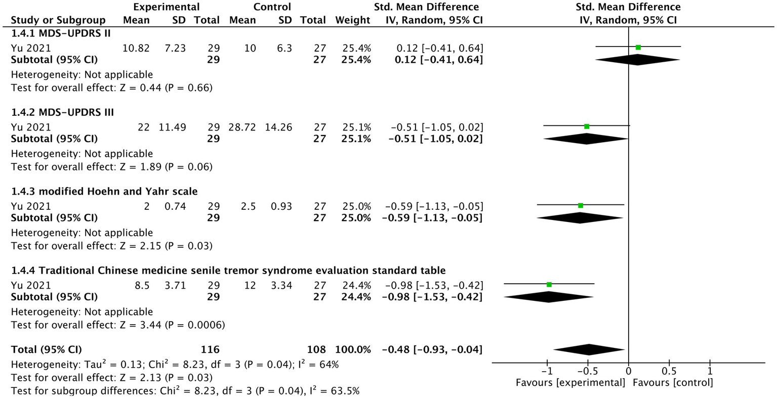 In one study (Yu, 2021), generally, tVNS significantly improved severity of motor signs under this combination of treatment (n = 224, SMD = −0.48, 95% CI = −0.93 to −0.04, p = 0.03) (Figure 5). There was no significant difference for MDS-UPDRS II between two groups (SMD = 0.12, 95% CI = −0.41 to 0.64, p = 0.66). However, a borderline improvement in MDS-UPDRS III was observed (SMD = −0.51, 95% CI = −1.05 to 0.02, p = 0.06). For modified Hoehn and Yahr scale (SMD = −0.59, 95% CI = −1.13 to −0.05, p = 0.03), and “Traditional Chinese medicine senile tremor syndrome evaluation standard table” (SMD = −0.98, 95% CI = −1.53 to −0.42, p = 0.0006), there were statistically significant improvement in tVNS group.