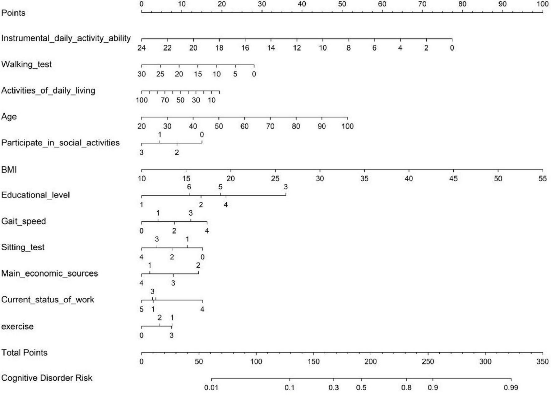 A multifactorial logistic regression analysis was conducted with the top 14 influences screened for importance by the random forest algorithm as the independent variables and the occurrence of cognitive impairment as the dependent variable. The variables and their assigned values are shown in Supplementary Table 2. The results of the analyses revealed that instrumental activities of daily living ability, walking ability, activities of daily living ability, age, participation in social activities, BMI, literacy, gait speed, sit-to-stand test performance, main economic source, current employment status, and exercise had an impact on the cognitive impairment of elderly individuals (Table 2).