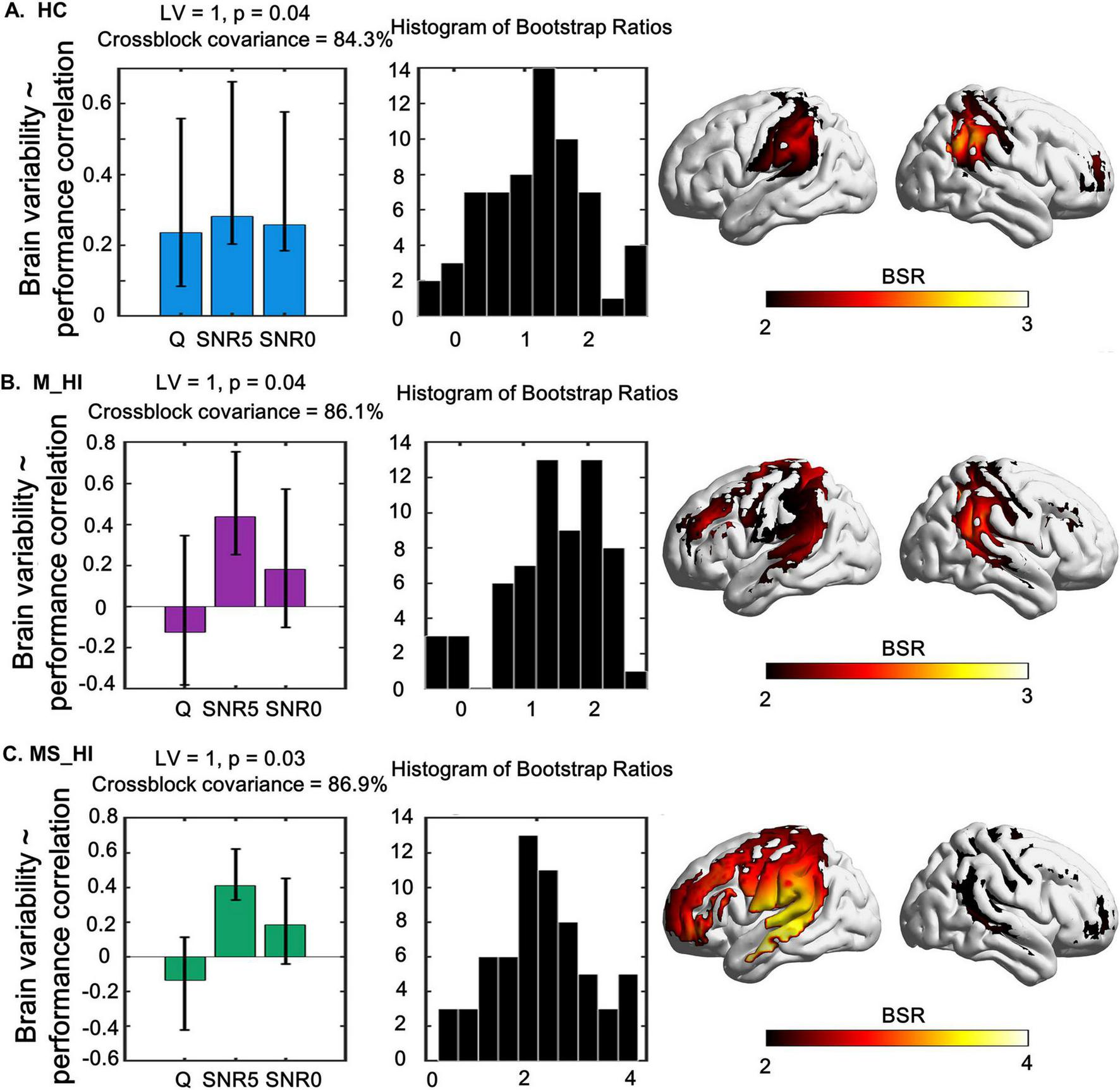 Figure 5. The relationship between task-modulated fNIRS signal variability and task-modulated performance using a behavior-PLS model are shown in left, and its associated spatial pattern expression in right. The middle column shows the distribution histogram of Bootstrap ratios. (A) Represents the HC group, (B) denotes the M_HI group, and (C) refers to the MS_HI group. HC, normal hearing; M_HI, mild hearing loss; MS_HI, moderately severe hearing loss. Yellow/red regions indicate greater up-modulation of brain variability with a decrease in accuracy. Error bars represent bootstrapped 95% confidence intervals. Bootstrap ratios increase from yellow to red, with a threshold value of greater than 2.00.