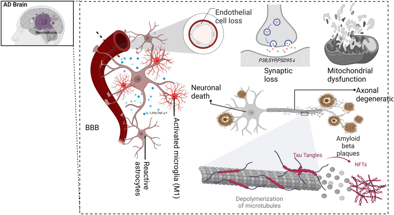 AD is defined by the aberrant accumulation of Aβ and tau proteins, which drive neurodegeneration. Aβ deposition begins decades before symptom onset, forming plaques that exacerbate neuronal dysfunction and cognitive decline (Caccamo et al., 2017). Aβ originates from amyloid precursor protein (APP) via sequential β-and γ-secretase cleavage. While APP processing can produce neuroprotective sAPPα, it also generates neurotoxic Aβ peptides, particularly oligomeric forms (Aβo), which disrupt synaptic function, promote neuronal loss, and activate inflammatory cascades (De la Rosa et al., 2020). Tau protein, a microtubule-associated protein predominantly expressed in neurons, stabilizes microtubules and supports axonal transport. Encoded on chromosome 17 (17q21), tau’s functional stability depends on its phosphorylation state. In AD, hyperphosphorylated tau aggregates into NFTs, destabilizing microtubules and impairing axonal function (Scheltens et al., 2021). Aβ and tau form a pathological feedback loop mediated by the PI3K/AKT/GSK-3β pathway. Aβ accumulation inhibits PI3K activity, relieving GSK-3β suppression, which promotes tau hyperphosphorylation. In turn, tau aggregation amplifies Aβ production by enhancing APP cleavage, accelerating plaque formation. This cycle is further compounded by chronic neuroinflammation. Neuroinflammation, driven by activated microglia and astrocytes, exacerbates neuronal injury (Trejo-Lopez et al., 2023). Aging and systemic inflammation disrupt blood–brain barrier integrity, allowing peripheral immune mediators to infiltrate the CNS, perpetuating a pro-inflammatory state. This chronic inflammation synergizes with Aβ and tau pathology, amplifying neuronal damage (Wang et al., 2023b). Recent evidence implicates necroptosis, a regulated form of necrotic cell death, as a downstream consequence of these processes. Unlike apoptosis, necroptosis exacerbates inflammation and tissue damage, representing a critical link between Aβ-tau interactions and AD progression.