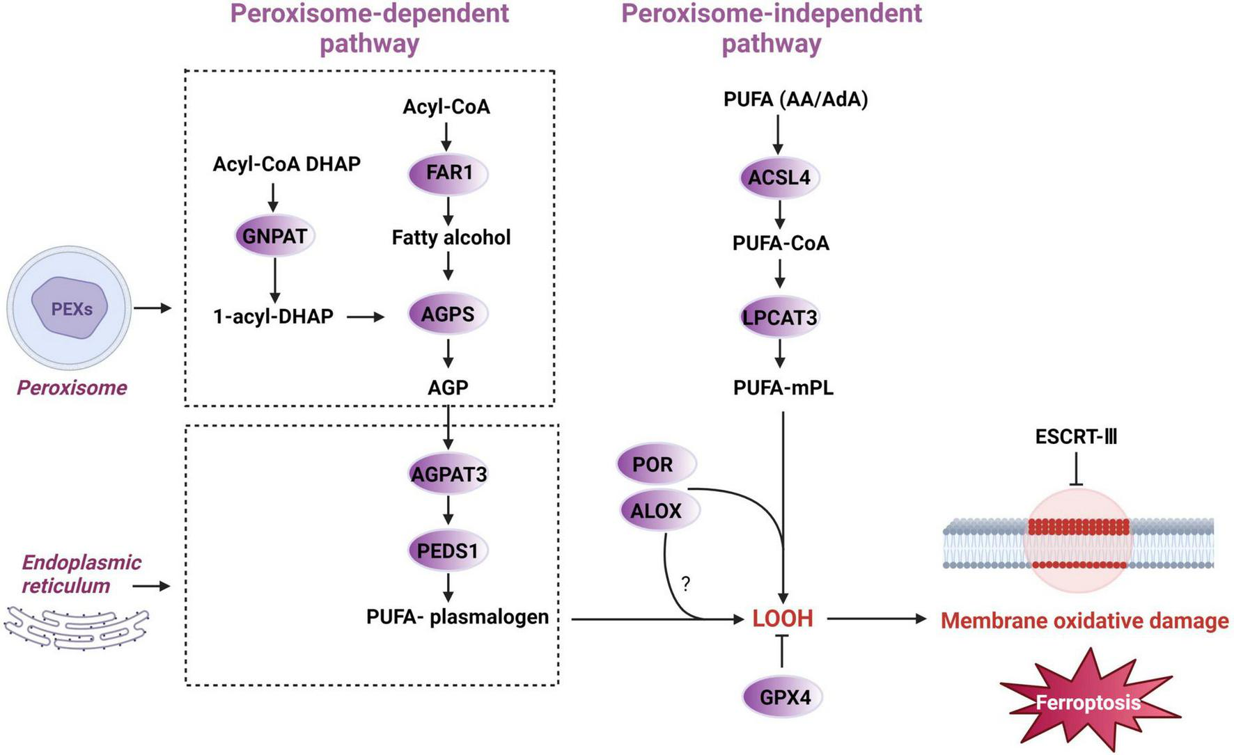 Peroxisomes, which are membrane-enclosed organelles involved in oxidative processes, play crucial roles in cellular lipid metabolism in processes such as the breakdown of very-long-chain fatty acids and the catabolism of hydrogen peroxide by catalase (CAT) (Wanders et al., 2023). Furthermore, upon activation, peroxisomes can increase the sensitivity of cells to ferroptosis (Zou et al., 2020a). Zou et al. (2020a) recently published their research in Nature, demonstrating that peroxisomes play a critical role in ferroptosis by producing plasmalogens, which serve as substrates for lipid peroxidation. Plasmalogens are more prone to oxidation than other lipid components, and peroxisomes are the sole organelles responsible for their biosynthesis (Zou et al., 2020a). This means that peroxisomes are involved in regulating the sensitivity of cells to ferroptosis. These discoveries offer a novel understanding of the lipid metabolic foundation of ferroptotic cell death.