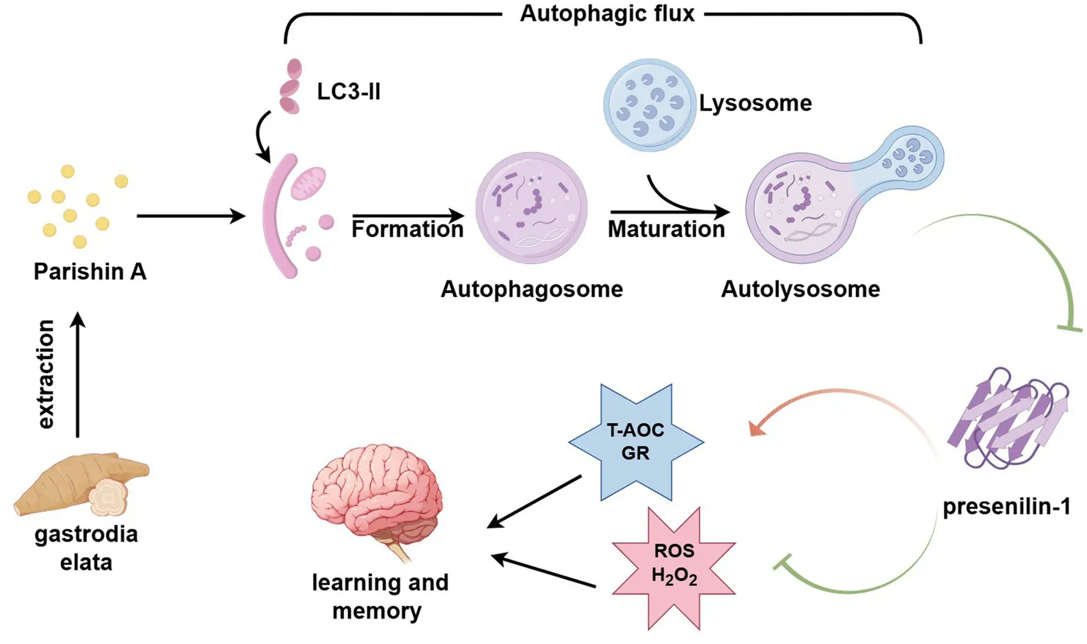 Parishin A enhances autophagy, leading to reduced PS1 expression and thereby improving learning and memory in AD mice.