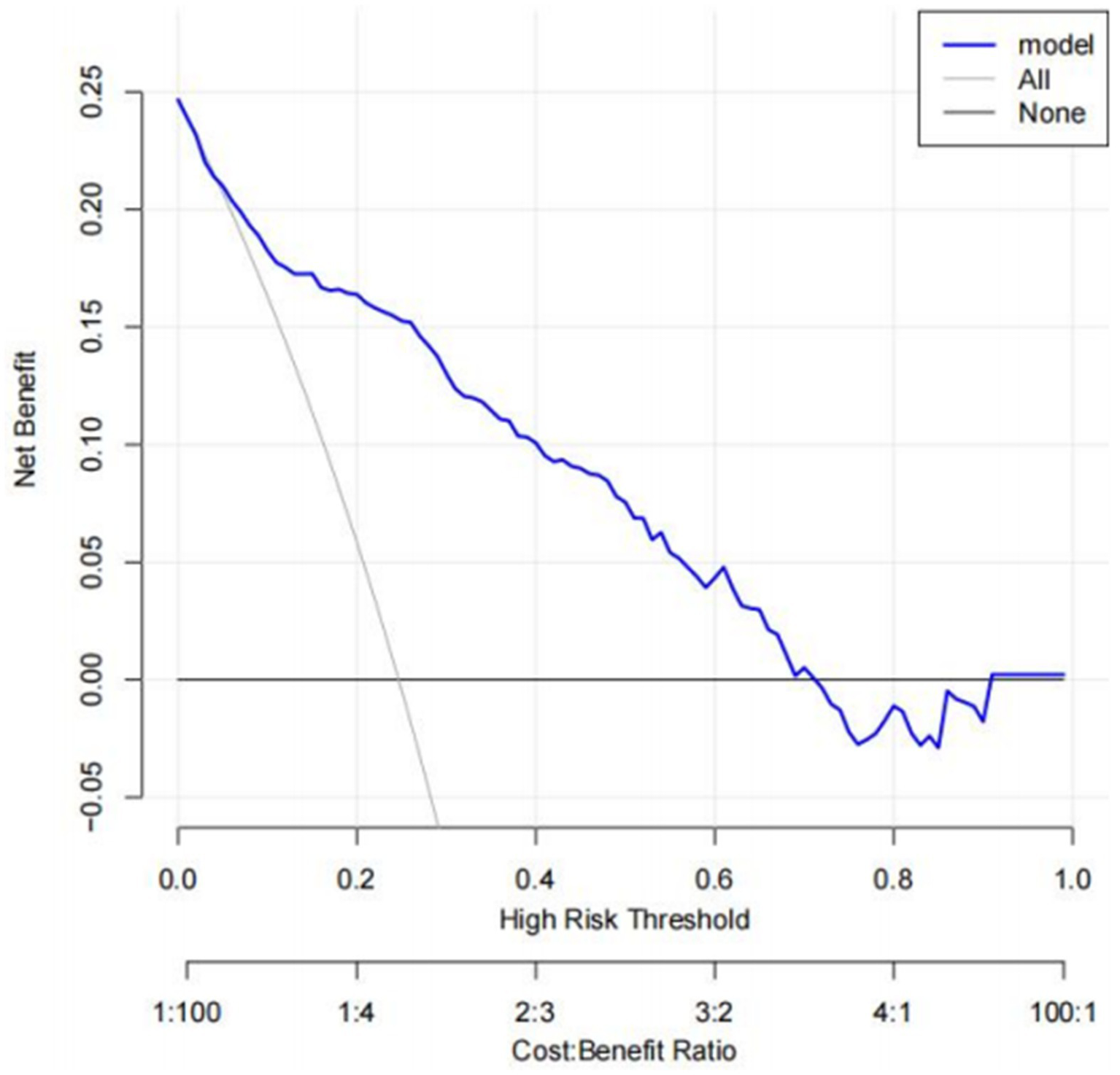 Decision curve analysis (DCA). The net benefit curves for the nomogram model are shown. X-axis indicates the threshold probability for low CF risk and Y-axis indicates the net benefit. The blue line represents the improvement predictive nomogram. The gray line represents the assumption that all patients used the nomogram model. The black line represents the assumption that no patients use the nomogram model to predict the risk of low CF.