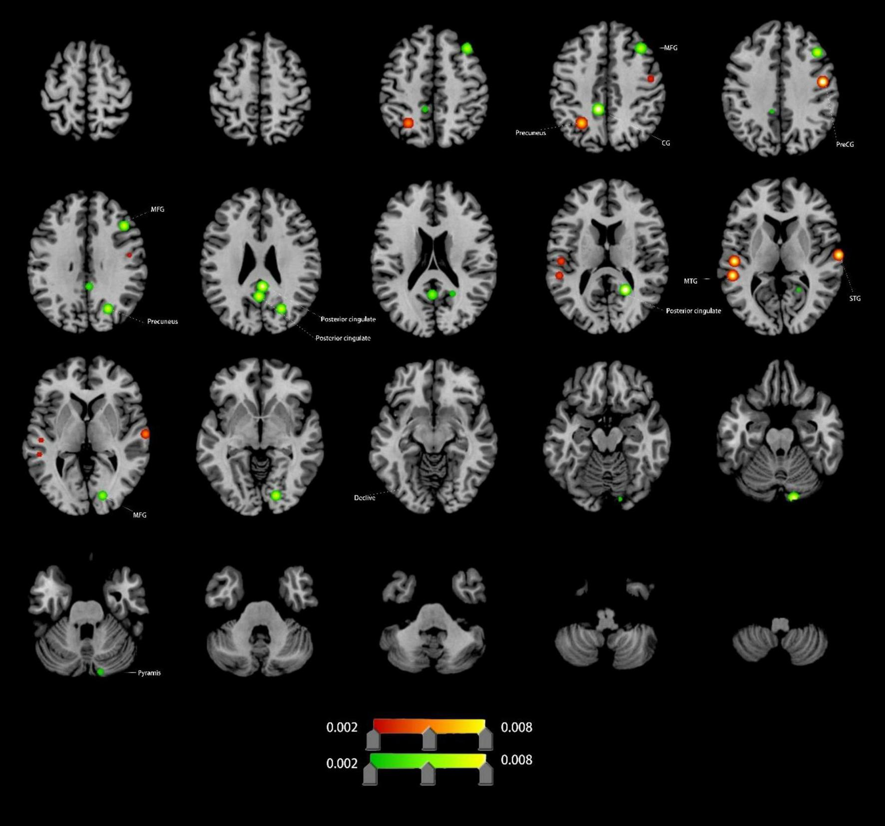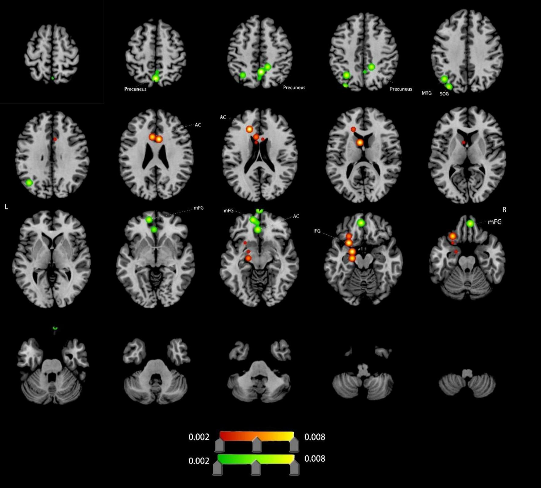 Compared to HCs, VCI patients demonstrated significant ALFF alterations, characterized by increased ALFF (4 clusters), left anterior cingulate cortex (ACC), left inferior frontal gyrus (IFG), decreased ALFF (11 clusters),left ACC (distinct subregion from increased cluster), bilateral medial frontal gyrus (mFG), bilateral precuneus, left middle temporal gyrus (MTG) and left superior occipital gyrus (SOG). Detailed spatial distributions and statistical thresholds are presented in Figure 2 and Table 1.