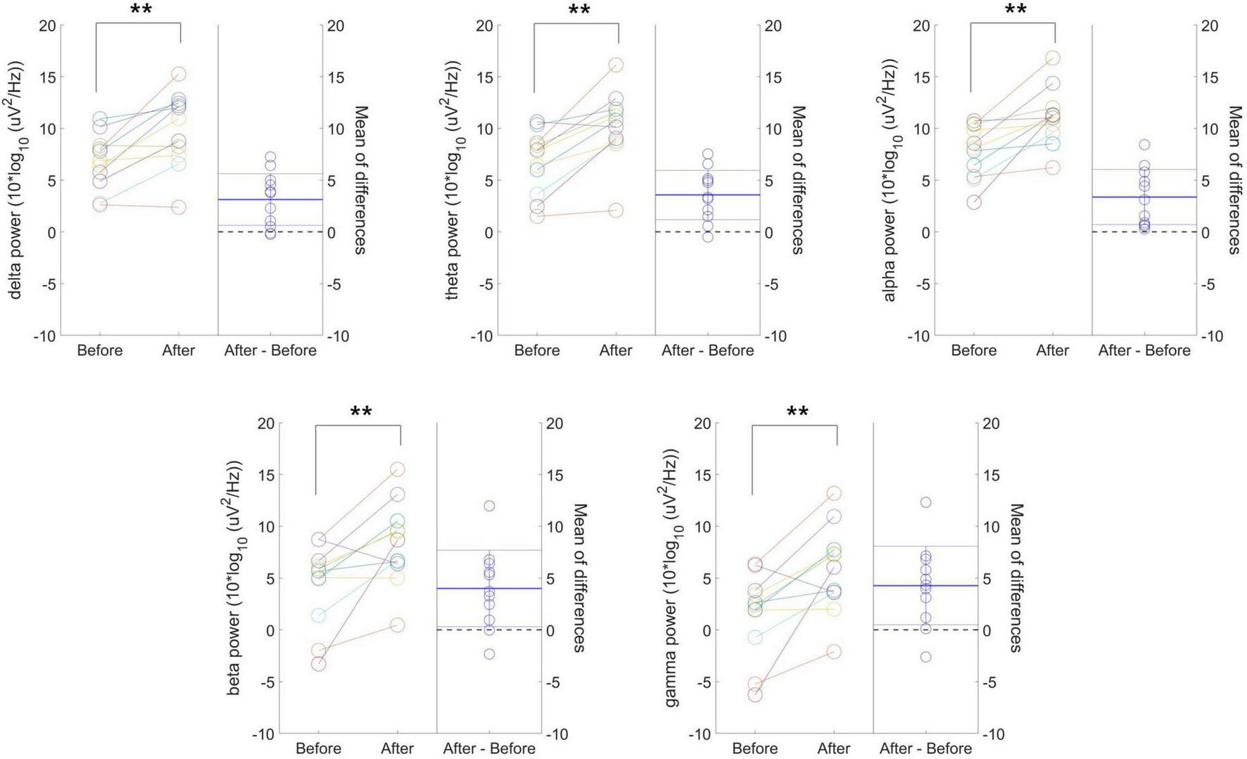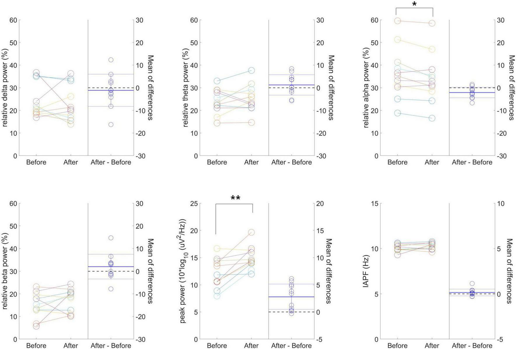 For the analysis of resting-state EEG, a finite impulse response (FIR) bandpass filter ranging from 1 to 50 Hz was applied to minimize noise in both high- and low-frequency bands. Four-second epochs were extracted, and baseline correction was performed. Epochs exceeding an amplitude of 100 μV or exhibiting high variability compared to the overall variability of all epochs were automatically identified and discarded. Artifact-free 45 epochs (3 min) were randomly selected for quantitative EEG analysis (Bae et al., 2024). The EEG power spectrum density (PSD) was calculated using the Pwelch method with a 2-s Hamming window and 50% overlap to minimize distortions at signal boundaries. Absolute powers were computed for the following five frequency bands: delta (1–4 Hz), theta (4–8 Hz), alpha (8–13 Hz), beta (13–30 Hz), and gamma (30–50 Hz). Relative powers for the delta, theta, alpha, and beta bands were calculated as relative delta, theta, alpha, and beta power, respectively, based on the 1–30 Hz range. Peak power was identified as the maximum spectral power within the frequency range of 6.5–14.5 Hz, and individual alpha peak frequency (IAPF) was measured within 7–14 Hz to identify the center of gravity frequency, minimizing sensitivity to noise (Christie et al., 2017). In addition, average PSD plots for the considered frequency bands were obtained both before and after tVAS stimulation for visual comparison.