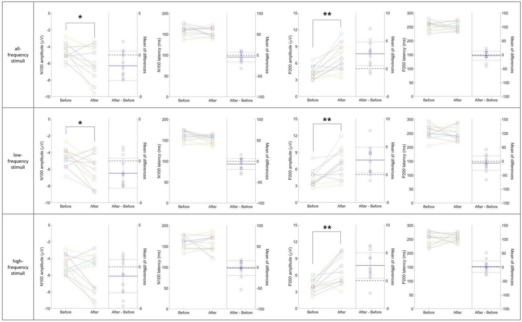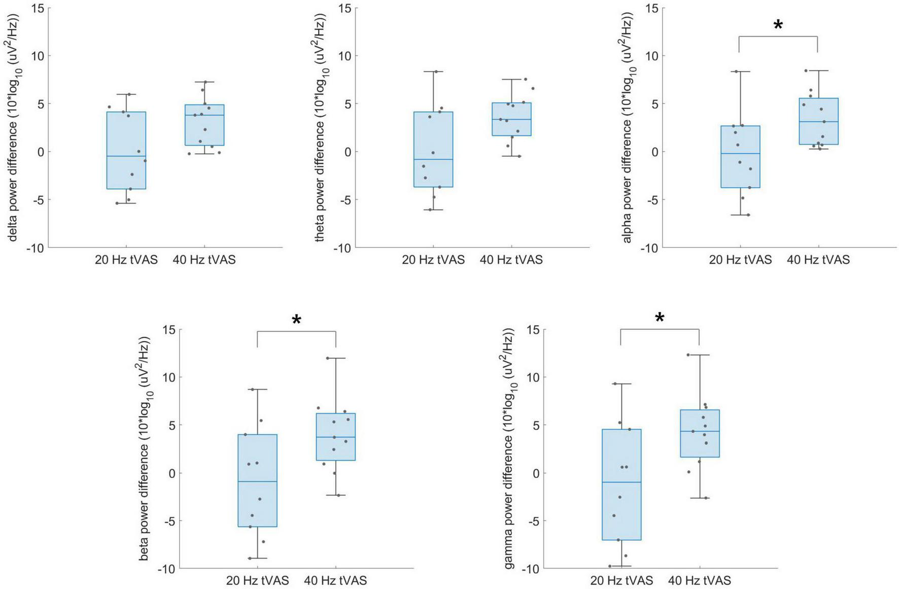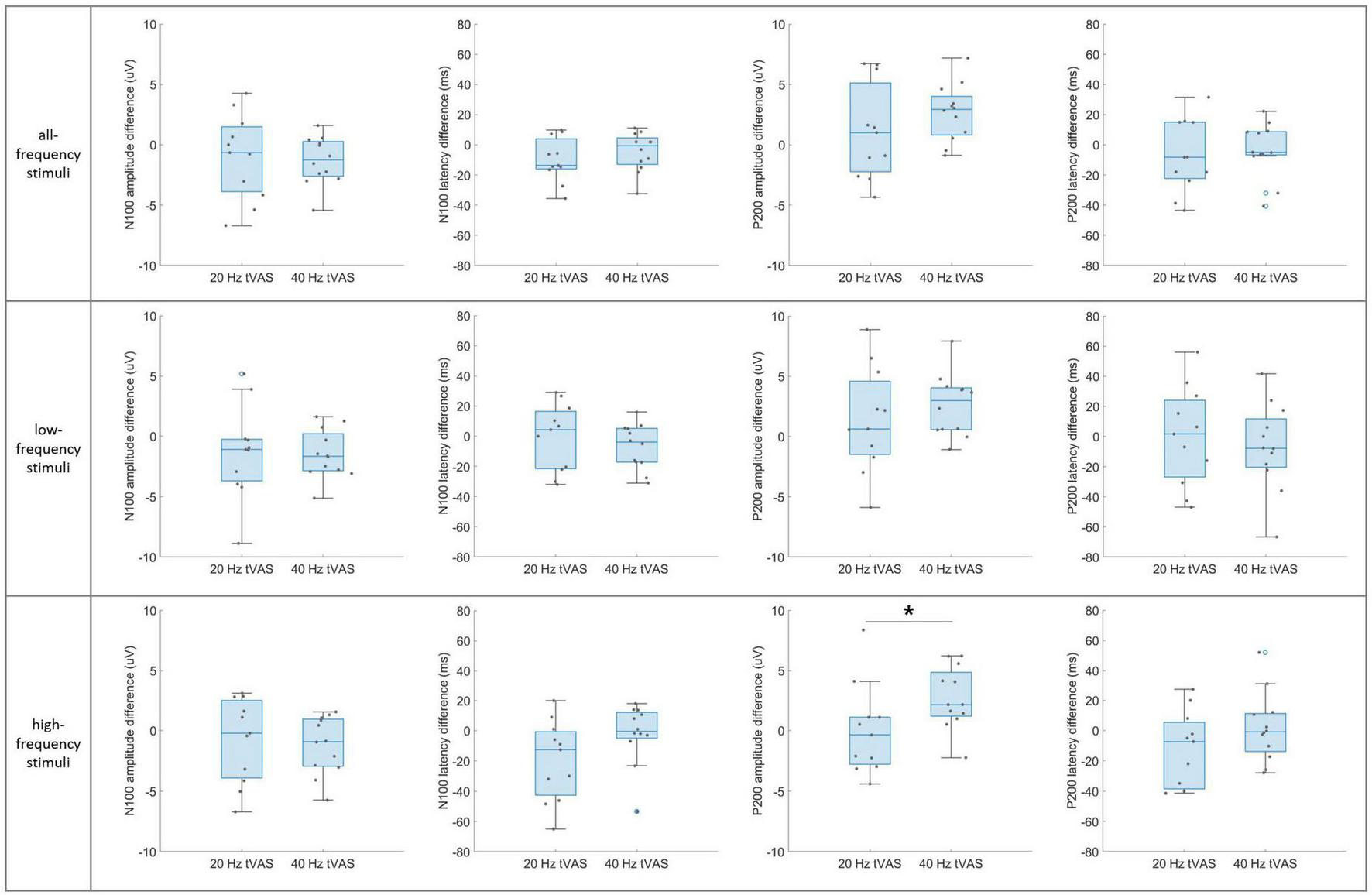 A paired sample t-test was performed to compare mean differences in resting-state EEG and sensory ERP variables before and after tVAS stimulation in both the 20 and 40 Hz groups, with normality assessed using the Shapiro–Wilk test. When normality assumptions were violated, the Wilcoxon signed-rank test was applied. An independent sample t-test was performed to examine the group-level differences between the 20 and 40 Hz groups. The difference scores before and after stimulation were extracted from resting-state EEG and sensory ERP variables for comparison. Normality was assessed using the Lilliefors test. Additionally, Levene’s test was conducted to check the assumption of homogeneity of variances, and when the assumption was not met, Welch’s t-test was used. Sensory ERP variables were categorized into three sub-types: low-frequency stimuli (125, 250, 500, and 750 Hz), high-frequency stimuli (1,500, 2,000, 3,000, and 4,000 Hz), and all-frequency stimuli (the combined average of all eight frequencies). Exploratory data analysis was conducted using IBM SPSS Statistics V27, while statistical analysis and data visualization were performed using MATLAB R2023a. Significance thresholds were set at α = 0.05 and 0.01.