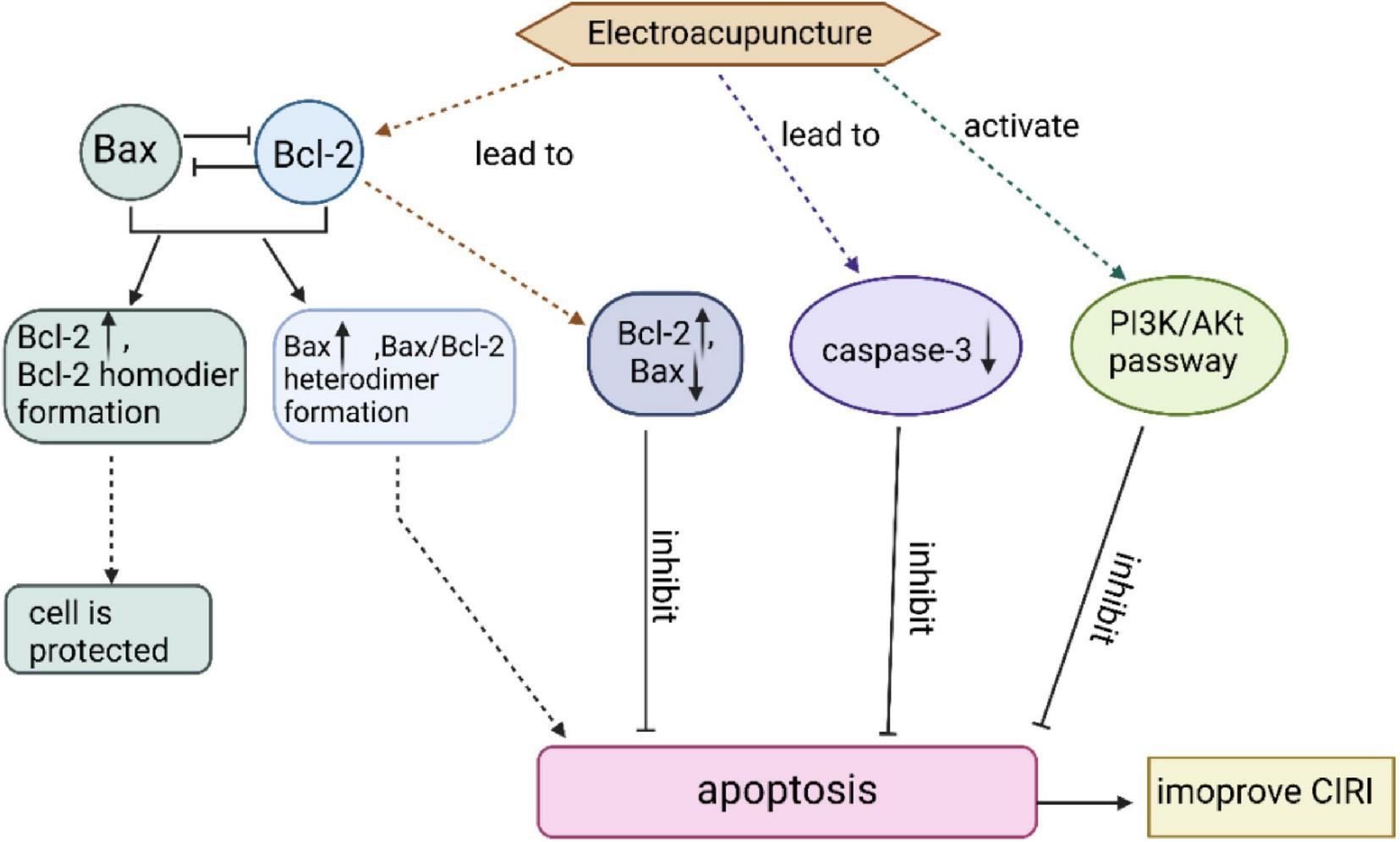Overexpression of Bcl-2 attenuates cell damage, whereas Bax acts in the opposite direction to Bcl-2 and has a pro-apoptotic effect. EA intervention in MCAO rats up-regulated Bcl-2 protein expression and down-regulated Bax protein expression, which significantly reduced the number of apoptotic cells and exerted neuroprotective effects. caspase-3 is an apoptotic execution factor that triggers cell apoptosis. EA can inhibit apoptosis in the ischemic brain tissue of stroke rats by reducing the expression of caspase-3. EA can also activate the PI3K/Akt pathway, causing a series of responses to inhibit neuronal apoptosis after CIRI.