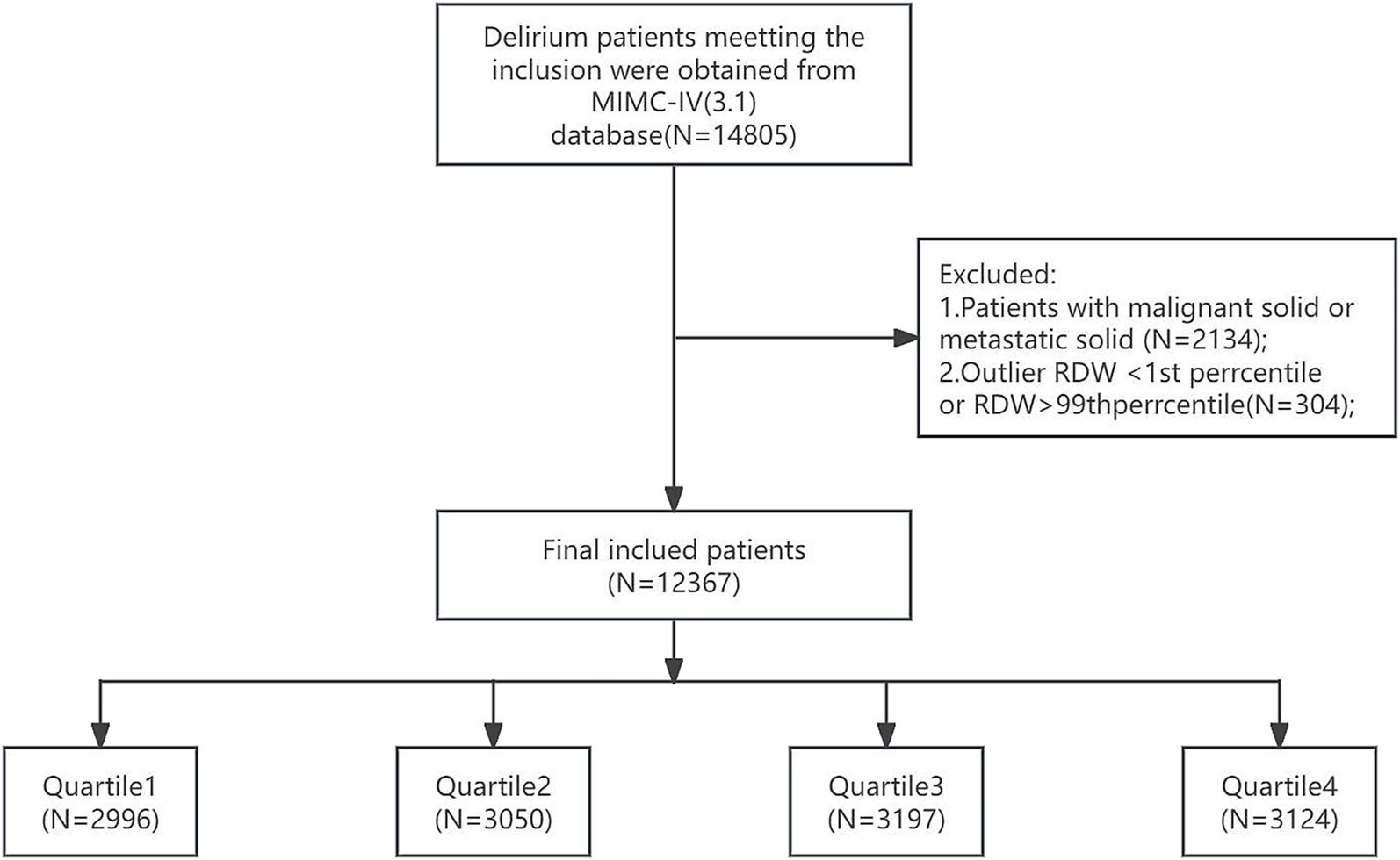 Patients were enrolled if they met the following criteria: (1) admitted to the hospital and the intensive care unit (ICU) for the first time; (2) RDW on the first day of admission to the ICU could be checked; (3) aged ≥ 18 years; (4) stayed in the ICU for more than 24 h; and (5) had a positive CAM-ICU screening result.