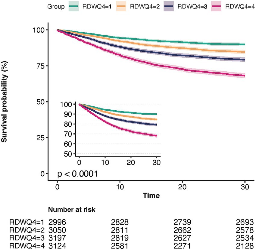 To further investigate the relationship between RDW and mortality, we used Cox proportional hazards regression models (Table 2). The association between red blood cell distribution width (RDW) and 30-day mortality was evaluated using a multivariate Cox regression model. Five models were constructed with incremental adjustments for covariates to assess the independent effects of RDW on mortality. RDW was analyzed as a continuous variable or quartile, and a dose-dependent increase in mortality risk was observed.