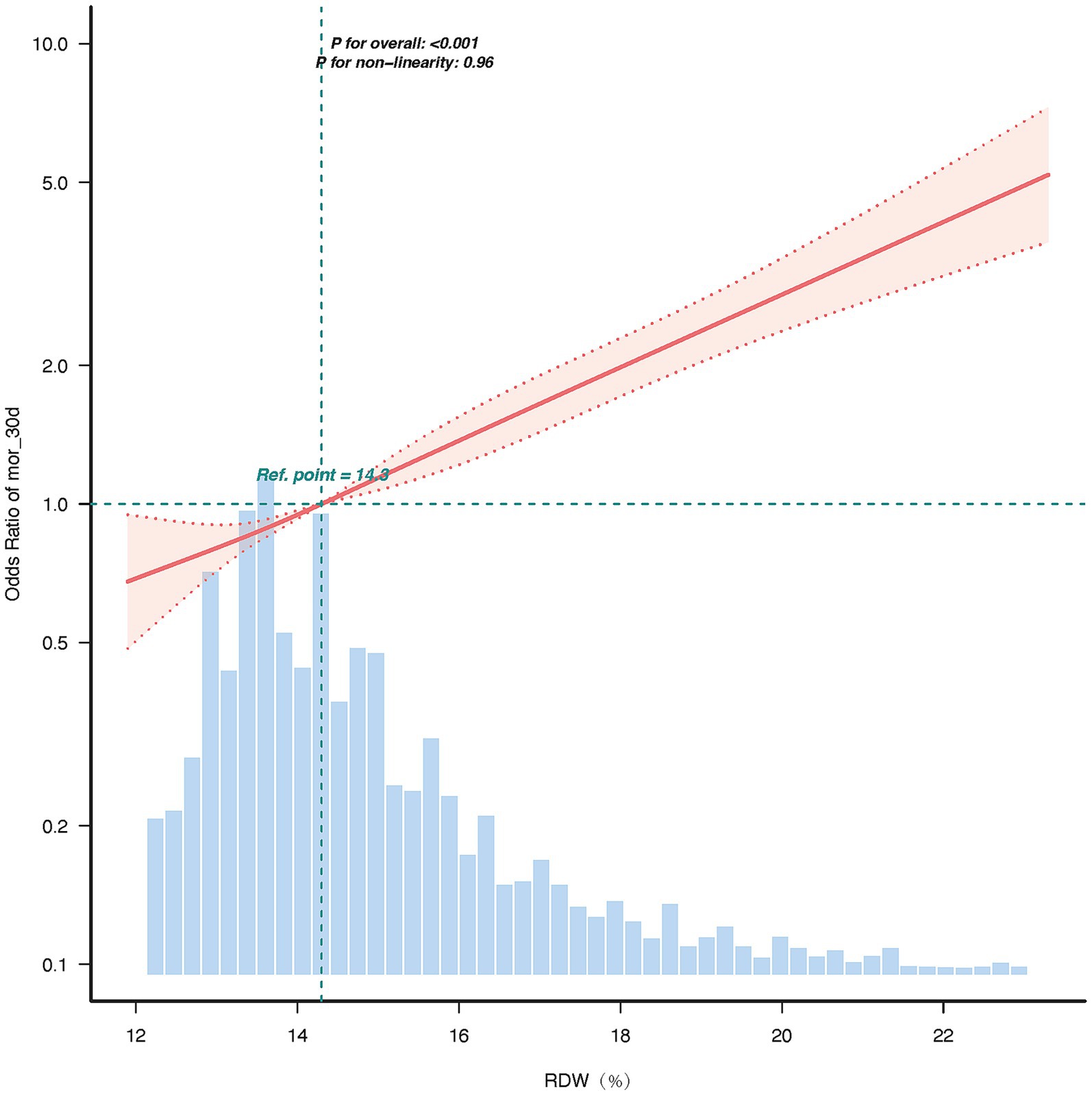 The restricted cubic splines (RCS) curve analysis revealed a linear relationship between the RDW and 30-day mortality, between RDW standard deviation and the hazard ratio for 30-day mortality, and p for non-linearity = 0.96. The hazard ratio increased progressively with higher RDW values, with the reference point set at 14.3% (HR = 1.0). In the upper range of RDW = 23.3%, the hazard ratio reached approximately 5.0, indicating a five-fold increase in risk compared to the reference point. The 95% confidence interval remained narrow across the range of RDW values, underscoring the precision of this association. These findings suggest that RDW is a strong and independent predictor of adverse outcomes, with a dose-dependent relationship.