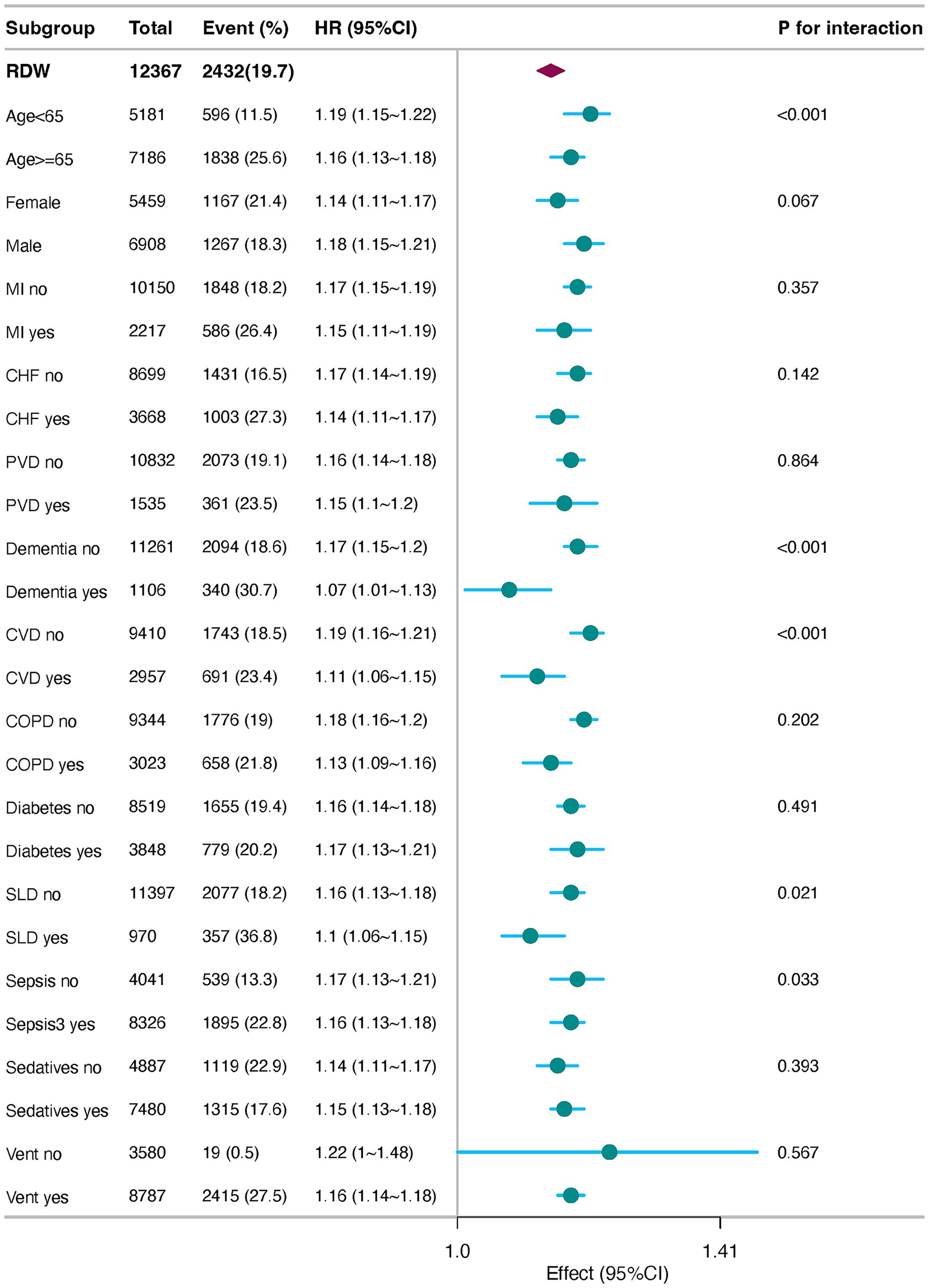 Figure 4. Forest plots of stratified analyses of RDW and 30-day all-cause mortality. MI, Myocardial Infarction; CHF, Congestive Heart Failure; PVD, Peripheral Vascular Disease; CVD, cerebrovascular disease; COPD, chronic pulmonary disease; SLD, severe liver disease; vent, ventilation.