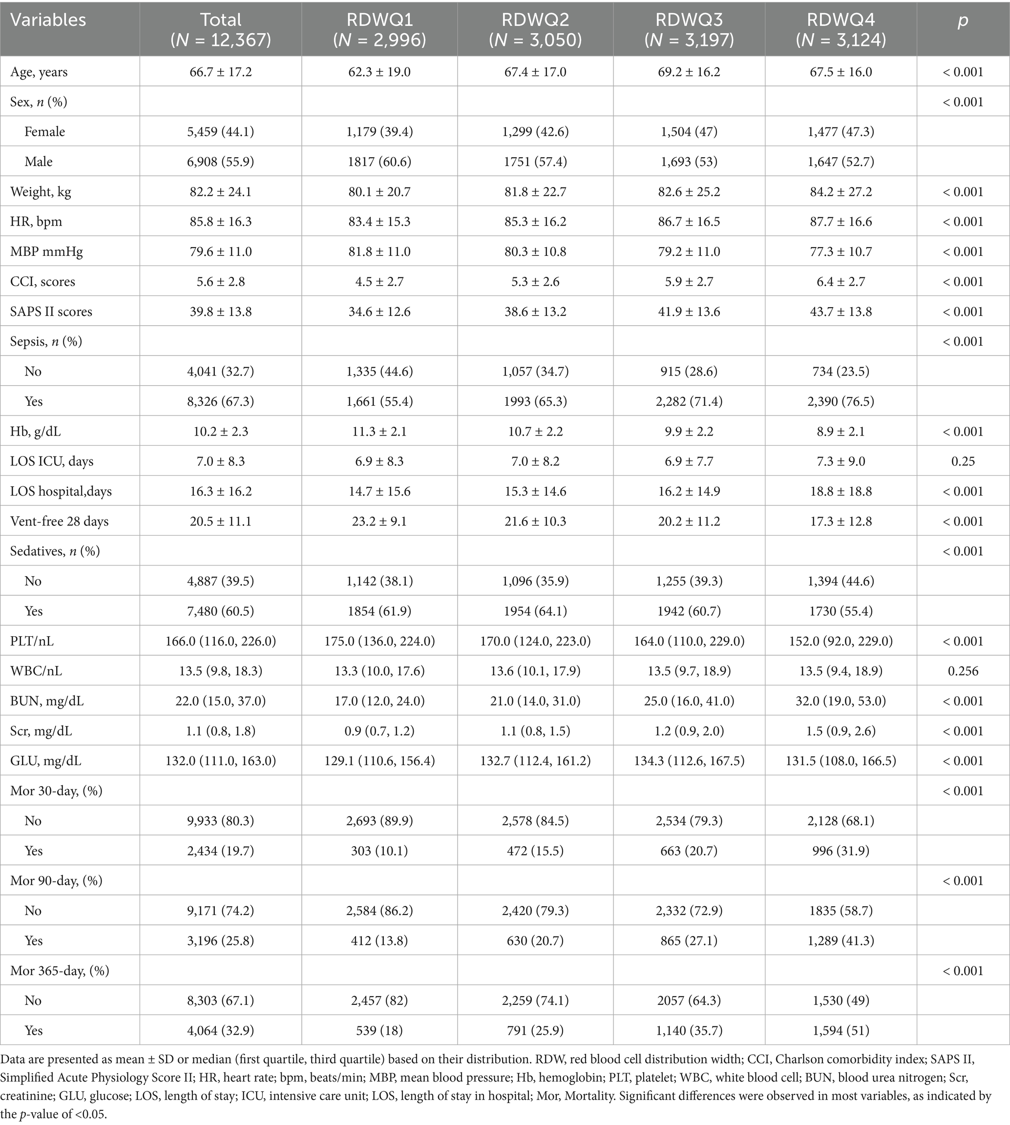 A total of 12,367 patients who were admitted to the ICU and diagnosed with delirium according to the Confusion Assessment Method for the Intensive Care Unit (CAM-ICU) criteria (Ely et al., 2001), stratified into four quartiles (Q1–Q4) based on the variable of interest, were included in our study. The 30-day mortality for the included patients was 19.7%, and the 365-day mortality was 32.9%. Mortality rates at 30, 90, and 365 days increased significantly across quartiles (p < 0.001). With the TRDW increases, the age tended to be older, with the mean age increasing from 62.3 ± 19.0 years in Q1 to 67.5 ± 16.0 years in Q4; weight, HR, CCI, SAPS II, BUN, SCR, and glucose tended to be higher; and MBP, PLT, Hb, and Ventfree28 tended to be lower. In contrast, no significant trends were observed for ICU length of stay (ICU-LOS; p = 0.25).