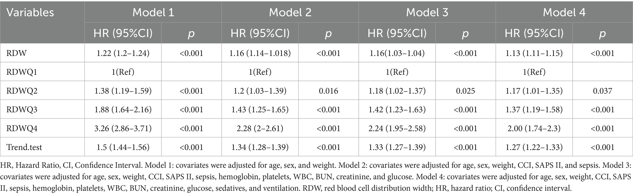 Model 3 (hemoglobin, platelets, WBC, BUN, creatinine, and glucose): The fully adjusted model confirmed the independent association between RDW and mortality, with HRs of 1.18 (Q2), 1.54 (Q3), and 2.25 (Q4; p-value for trend < 0.001). Model 4 (fully adjusted for age, sex, weight, CCI, SAPS II, sepsis, hemoglobin, platelets, WBC, BUN, creatinine, glucose, sedatives and ventilation): The fully adjusted model confirmed the independent association between RDW and mortality, with HRs of 1.18 (Q2), 1.54 (Q3), and 2.25 (Q4; p-value for trend < 0.001).